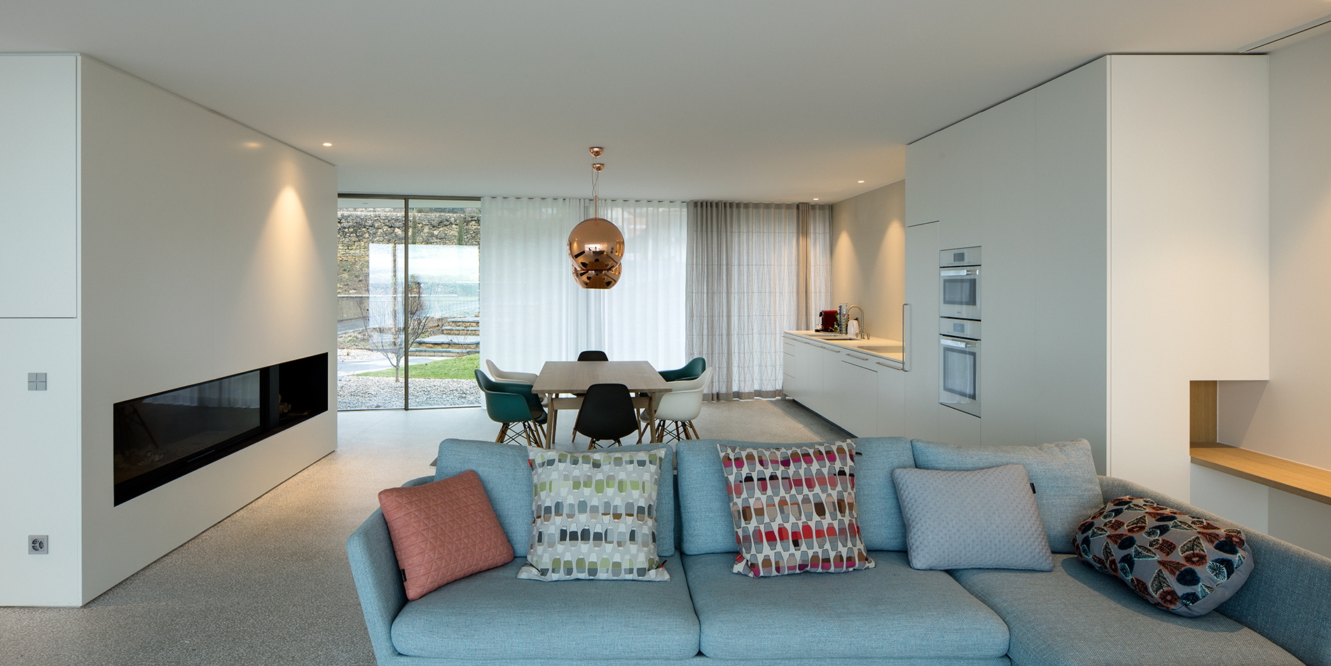 An independent apartment for friends is organized on the remaining volume on the south side with exit on the large lower terrace with swimming pool. Two distinct worlds are superimposed; a more aerial and open on the upper floor, the other more intimate and contained on the lower floor. One was cut in the topography in concrete and natural stone, the other is the fluid space contained between the floor and the roof materialized in glass and wood.