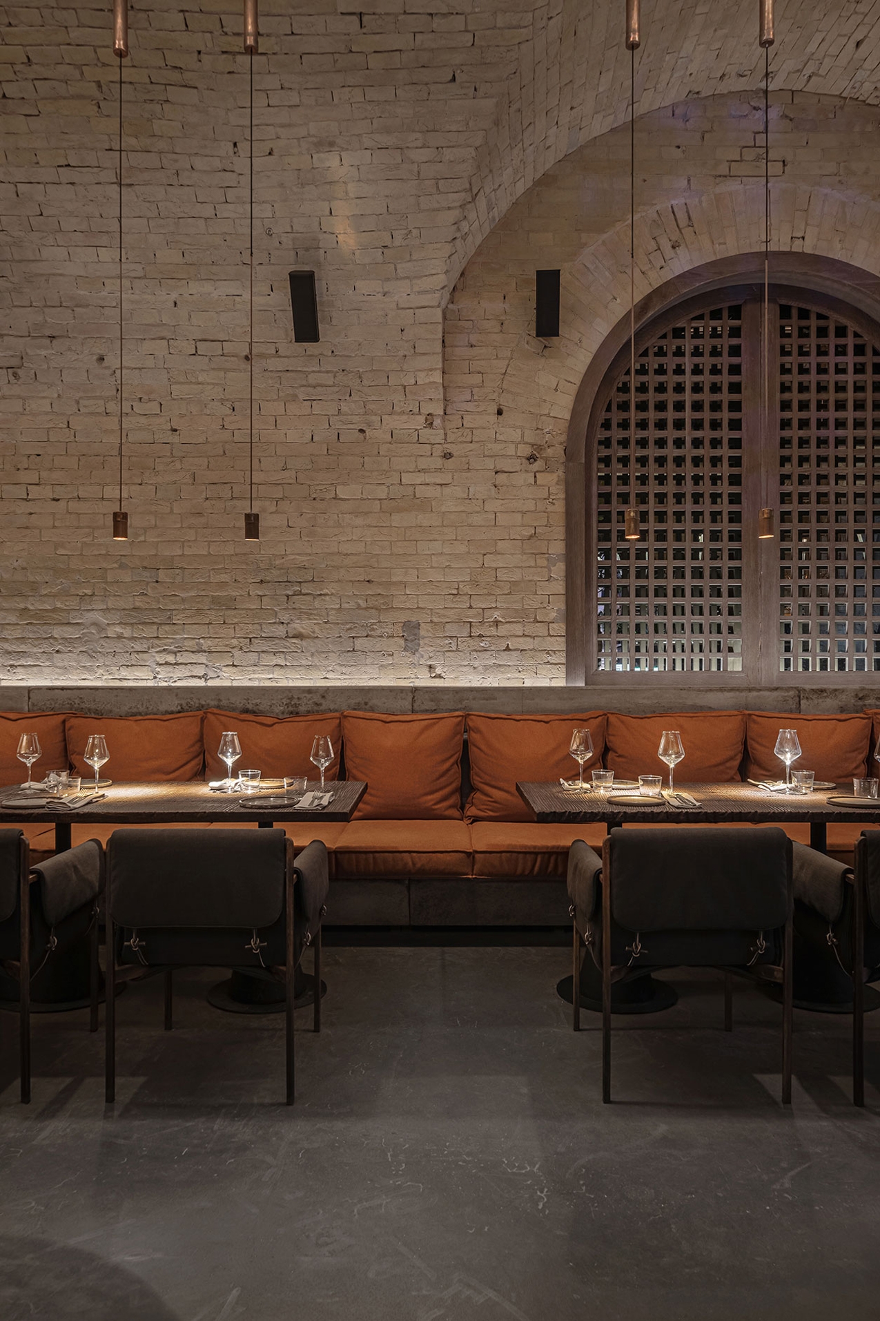 By creating the project, designers used natural materials as a part of the space design concept. The tabletops are made of natural wood, lamps are made of copper, seats, and chairs are made of wood and natural leather; metals and metal mesh perform both the function of space zoning and create special decorative elements.