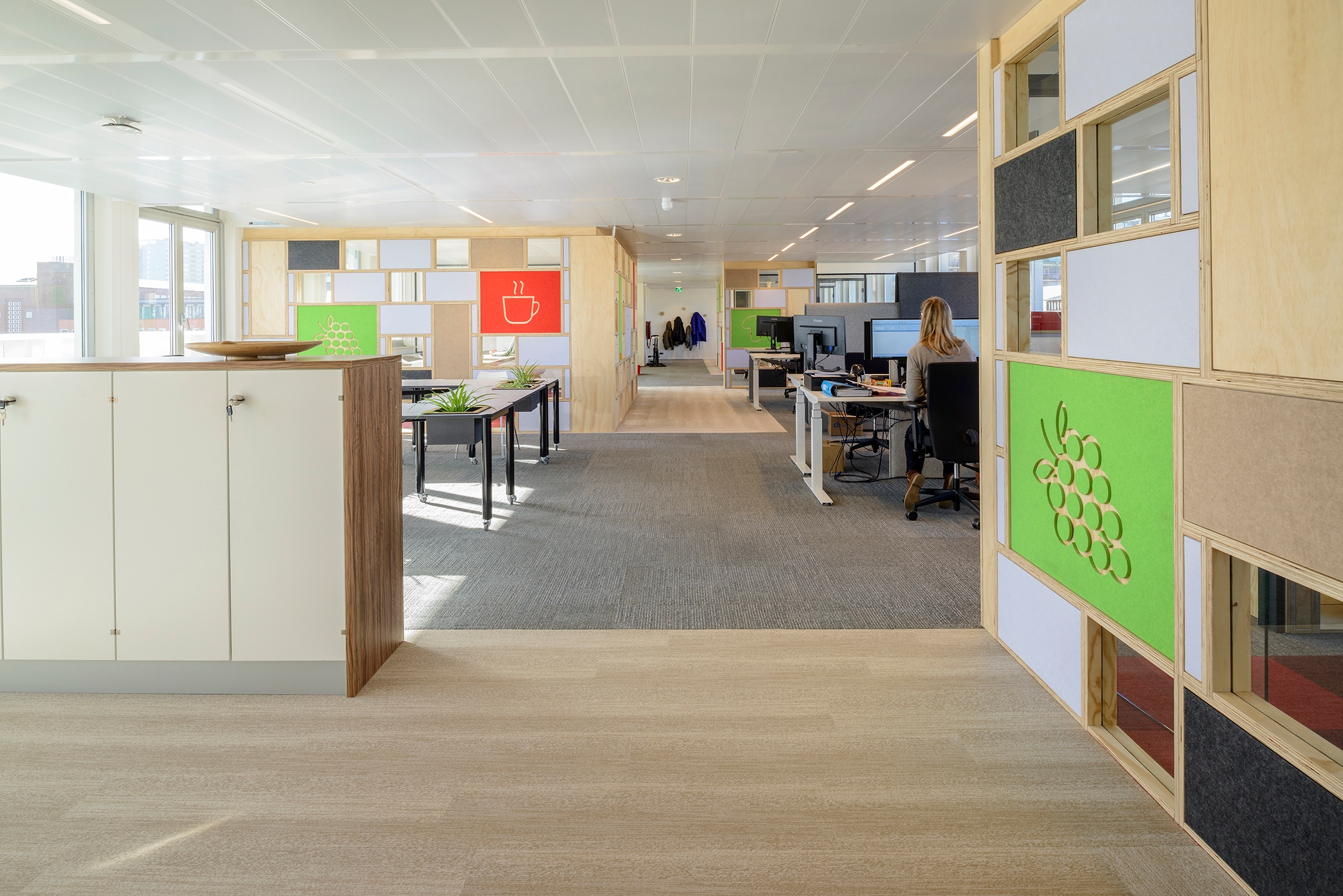The design by LIAG has resulted in a healthy and comfortable working environment. The arrangement of spaces encourages movement and encounters and stimulates people to alternate between seated and standing work. A ‘path’ connects the various types of workspaces, which include the ultimate silent area and flexible workspaces, which employees select to suit the nature of their work activities. The interior exudes a green and ‘foody’ feel, with atmospheric images of healthy food and lampshades made from mushrooms. The use of substances that harm the environment has been avoided.