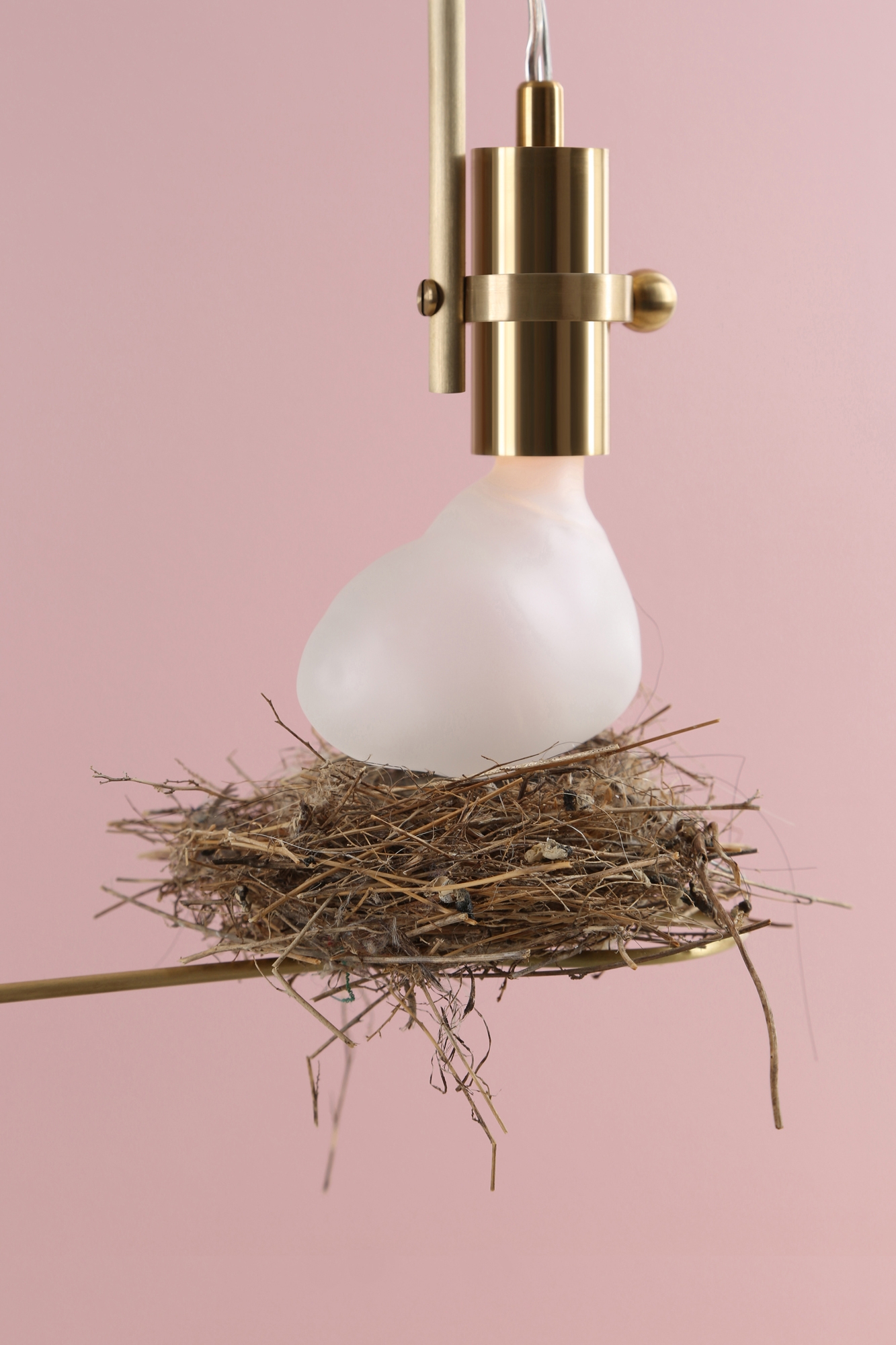 “WAKE UP CALL” is a limited edition of table lamps composed of brass structure and hand blown organic shaped sandblasted bulbs emphasizing the light on a landscape of multiple types of semi precious rocks while highlighting on abandoned bird nests accentuating the call for help.