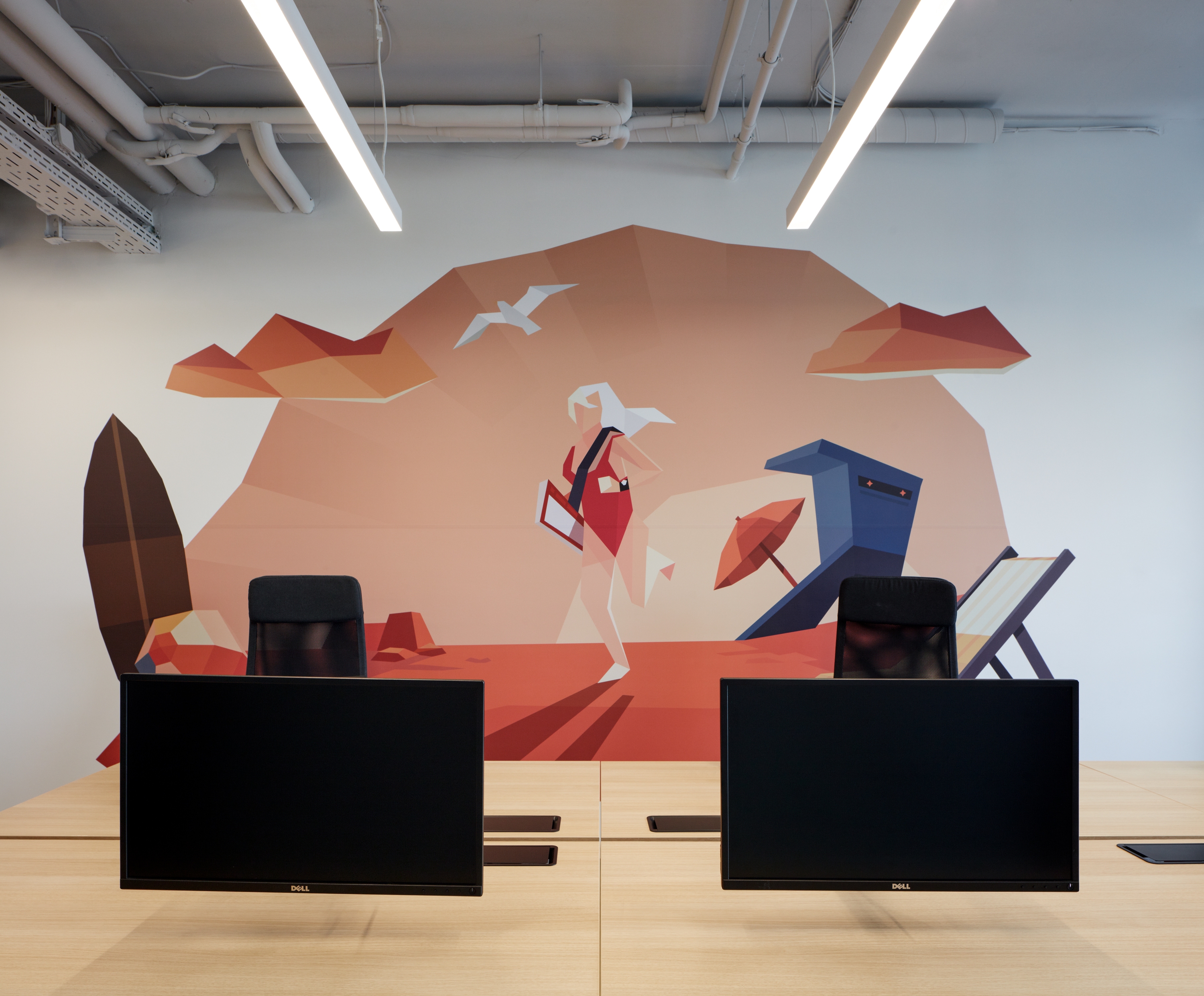 One can surrender to WebSupport's strong visual style and communication through blogs or podcasts very easily. Architects decided not to resist either. They built the workspace the same way as a computer motherboard – a base to all things digital. Each functioning part is implemented within a neutral palette of shared spaces. Every section was assigned one colour based on brand identity graphics by Pavel Novak. Hue gradients and infinity mirrors full of neon reflections give rooms a specific depth of a comic book picture.