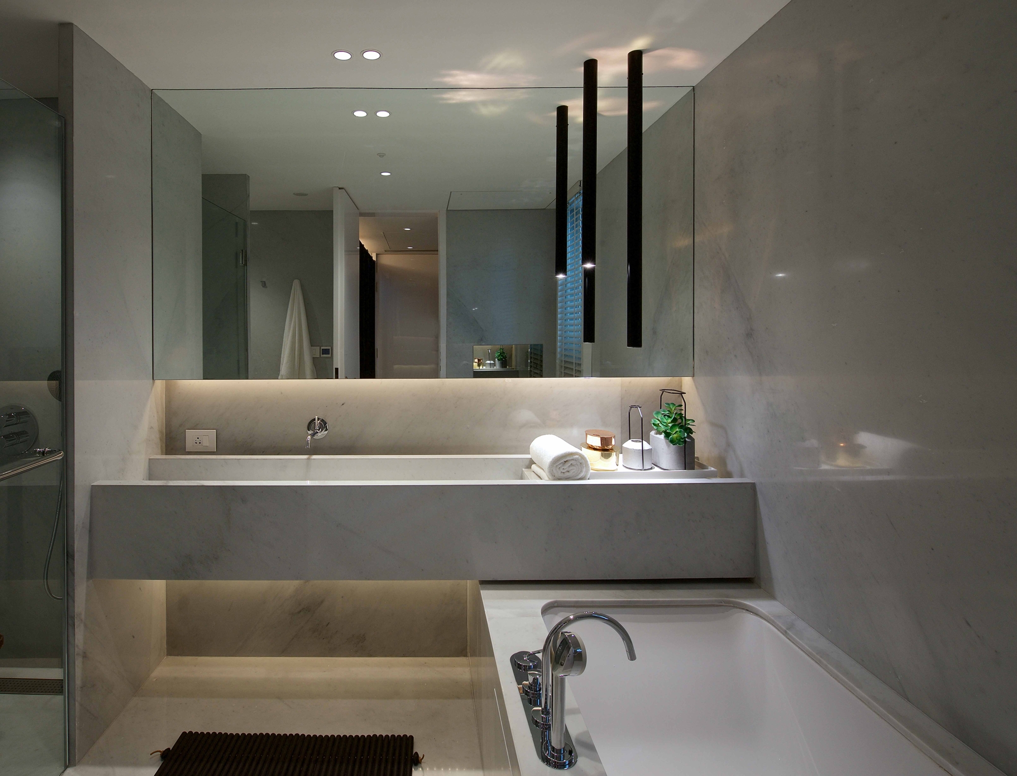 Floors throughout are covered in a cool pale gray terrazzo, barring timber in the gym and movie room. Polished plaster gray walls beautifully deflect light throughout the space, and offset the slender polished bronze railing running vertically along the terrazzo staircase.