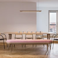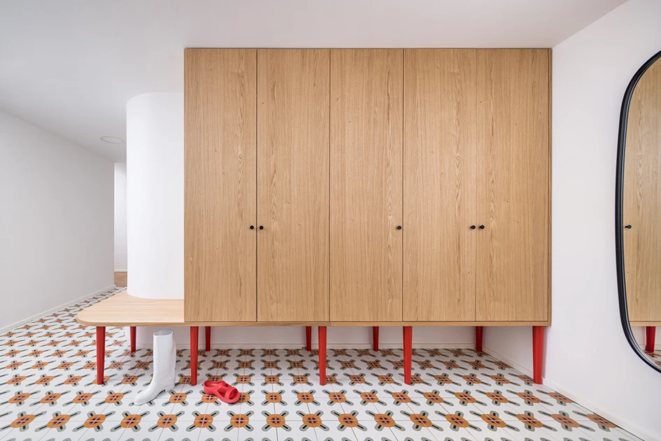 As part of the overhaul of the layout, we first separated a chunk of the living room and made it into a study, playroom and guest room in one, to settle the overly monumental apartment into a more practical area for family living. This added another layer of potential living constellations, peppered with the ability to monumentalize the space at any time by opening large sliding doors that can disappear seamlessly behind a large bookcase. Step by step, the dwelling was then equipped with furniture designed to suit the apartment and its occupants, whether it was a dining table and bench, a dressing room or valet stand with a mirror, a kitchen, a bar, work desks, a bedroom or play areas for children.