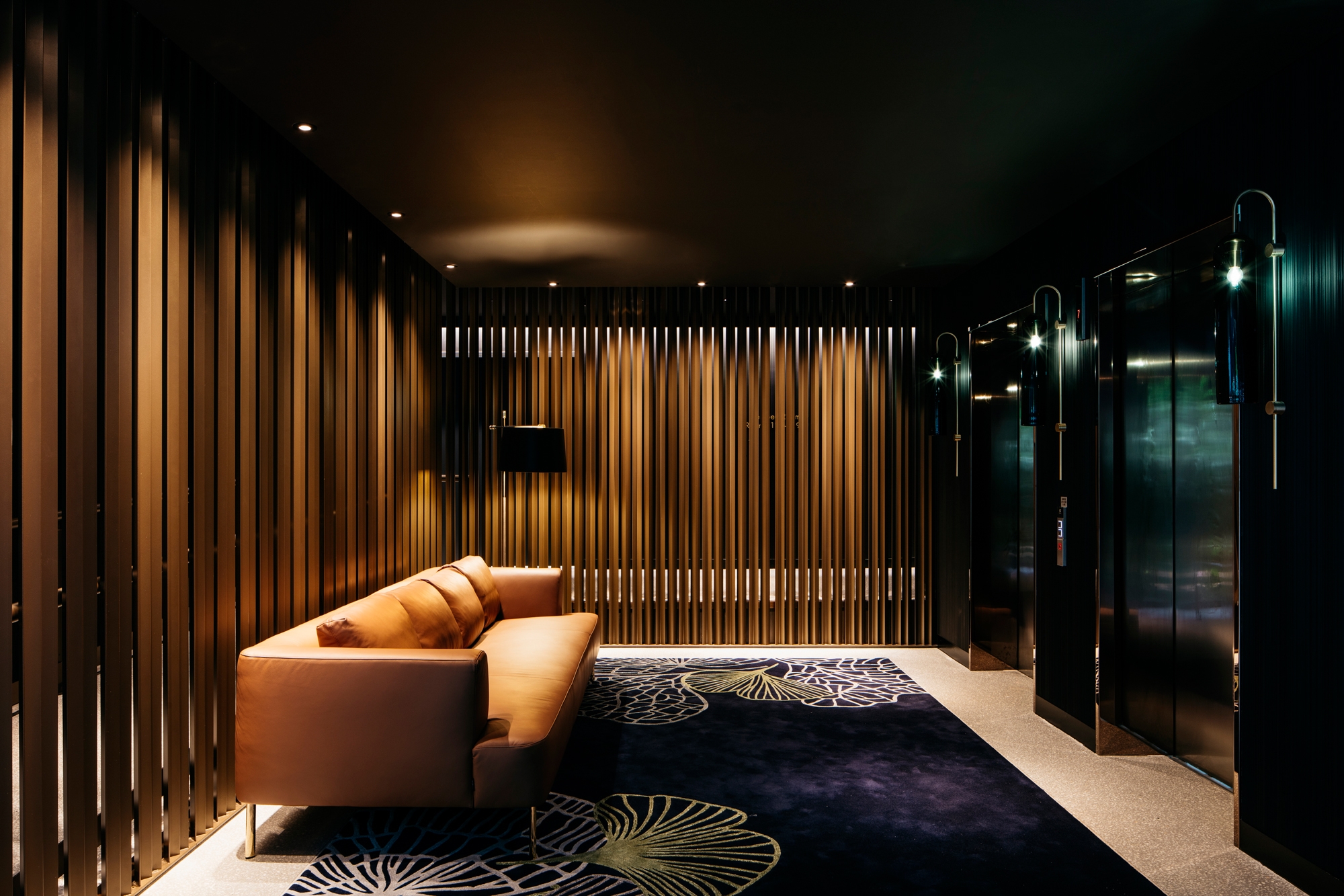 From the point of arrival, native flora is referenced in a bespoke botanical artwork that sits behind a minimalist reception desk. Designed to be immersive, the lobby features charcoal brickwork walls and a graphic timber floor of warm rich tones. Suspended from above, a custom sculptural lighting piece functions as a cloud-like installation within the space.