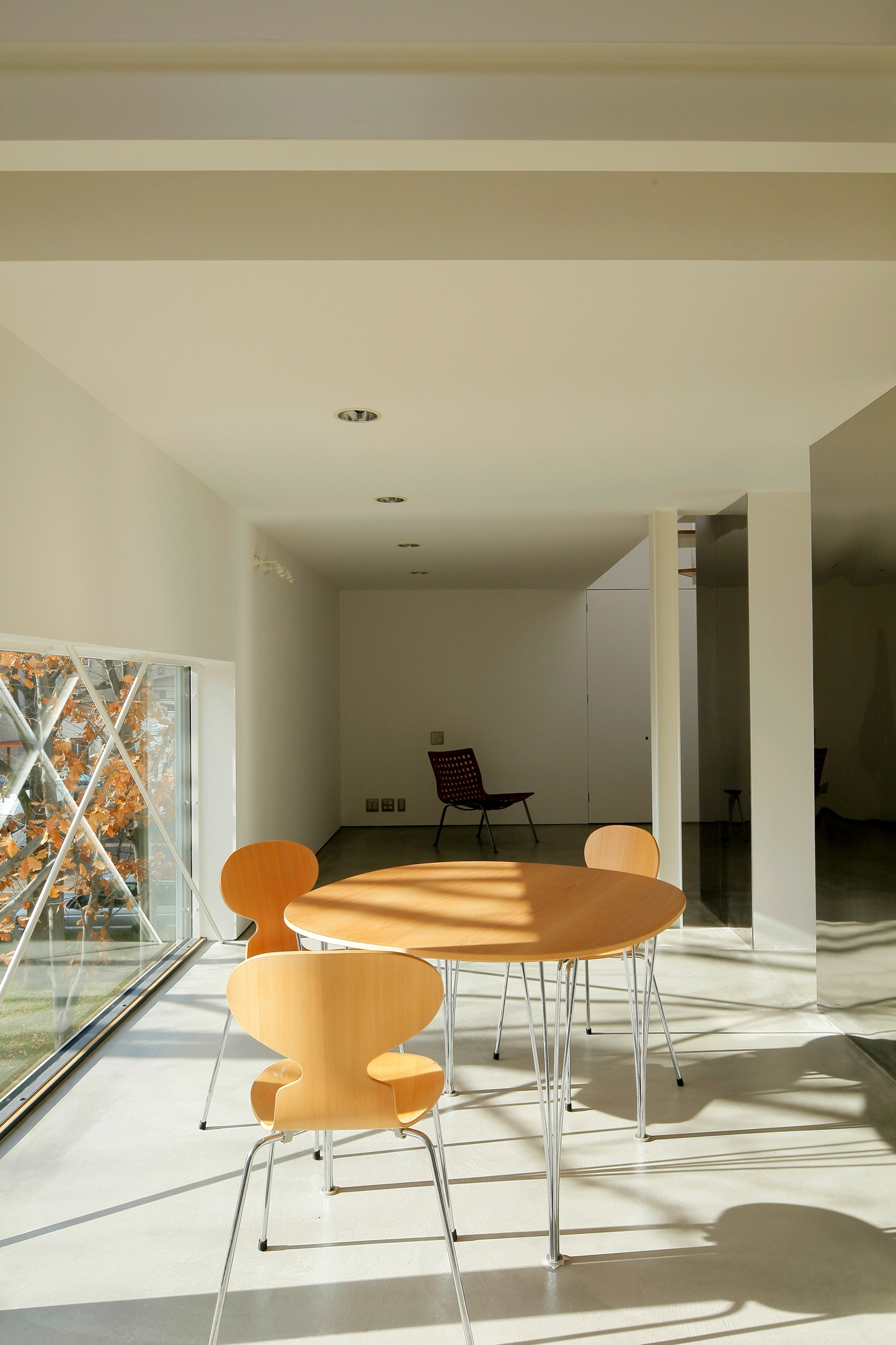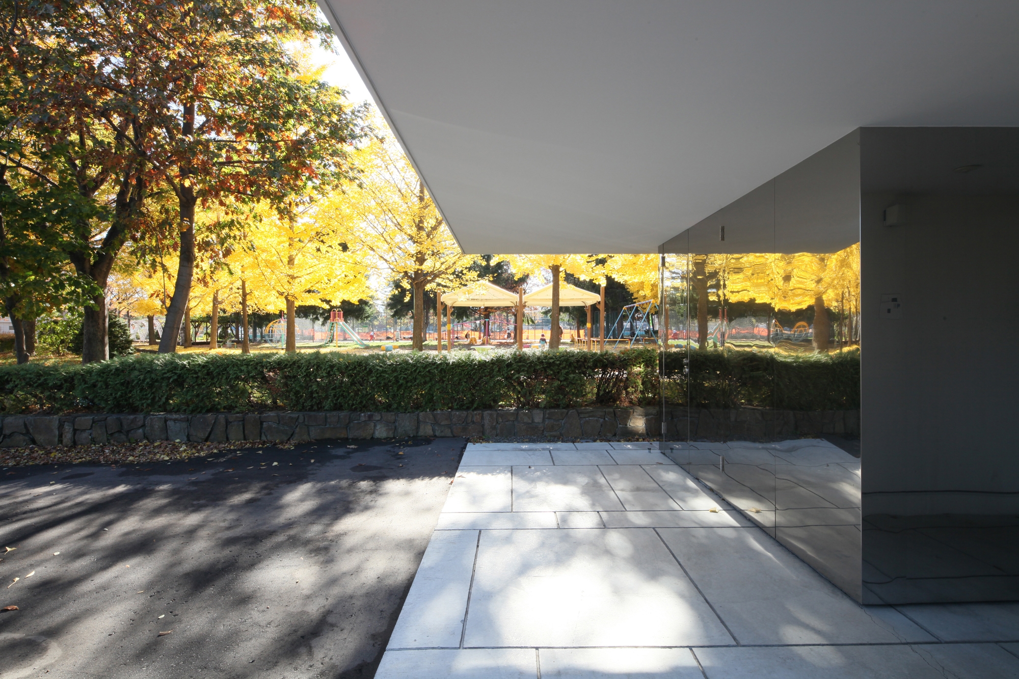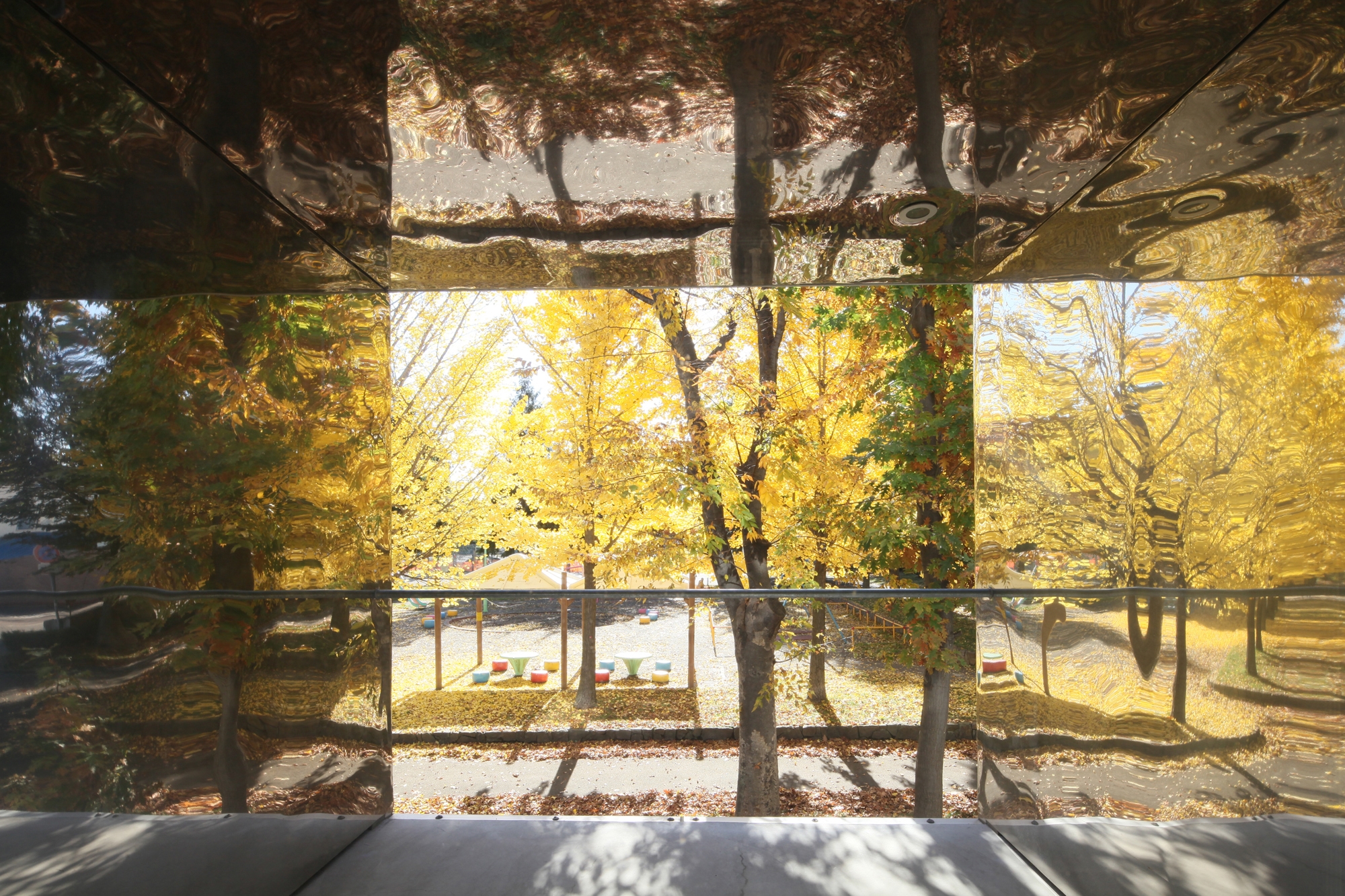 Since the building will continue to exist on the specific site, development of a relationship with the surrounding universal environment is important, and it is a theme that must be tackled continuously. In order to capture various sceneries of the neighboring park inside the house, and to create a portion of the exterior skin for the building, 0.35mm thick stainless steel sheets are placed on the interior and exterior of the house. As time and the seasons go by, the somewhat distorted reflections of the scenery on these thin stainless steel sheets keep changing.