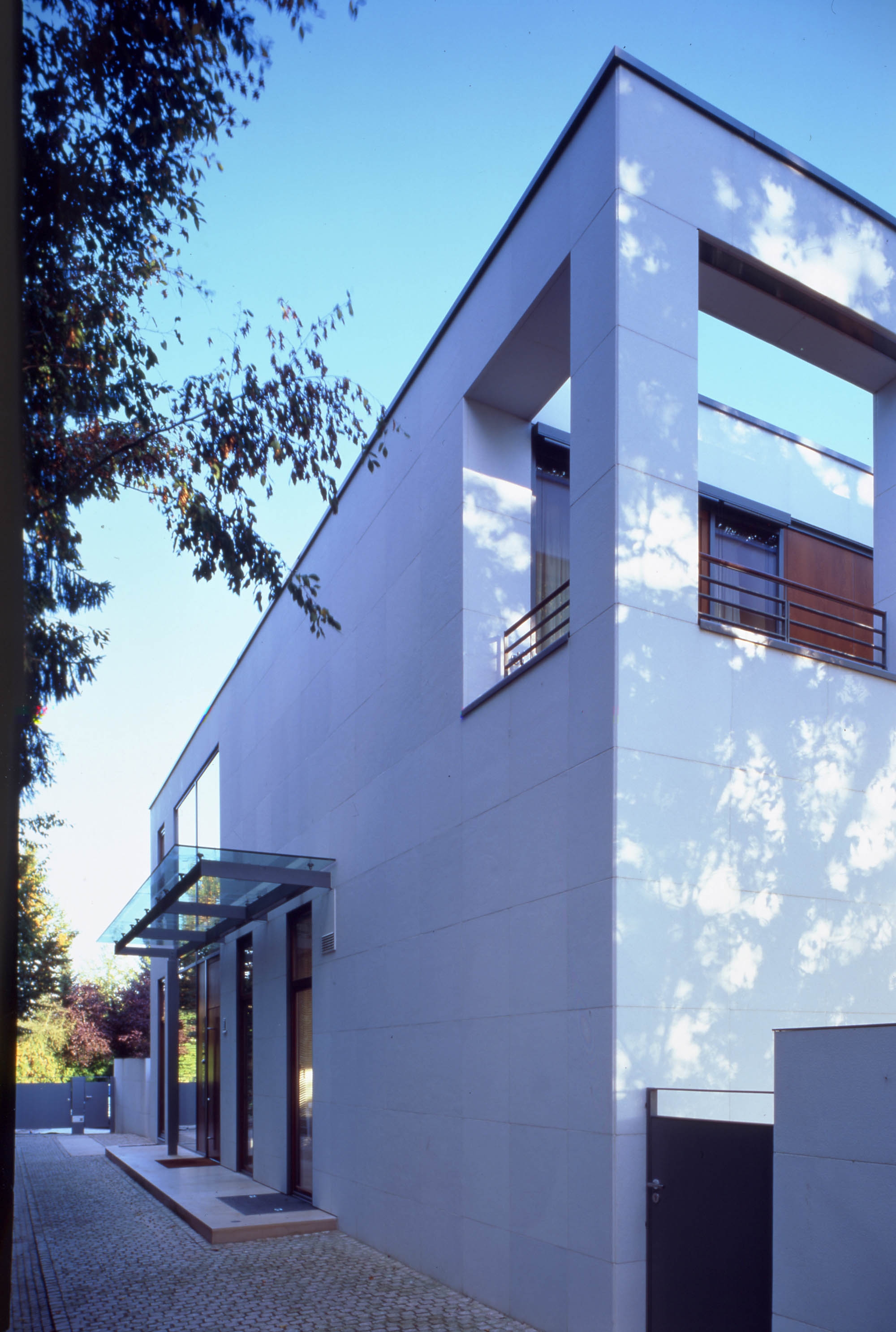 We have built a brilliant white cube with a distinctly structured façade in rough Thassos marble. The south façade protrudes into the garden, far beyond the supporting walls, columns, enclosed balcony and floating roof beams of the upper floor. Three terraces provide a range of external seating areas. The interior radiates a feeling of intimacy and comfort despite the spacious open-plan layout. Great care has been taken with the detail and finish of the few chosen materials, marble, limestone, glass and oiled white oak. The villa has been constructed as a low energy house with state-of-the-art building services.