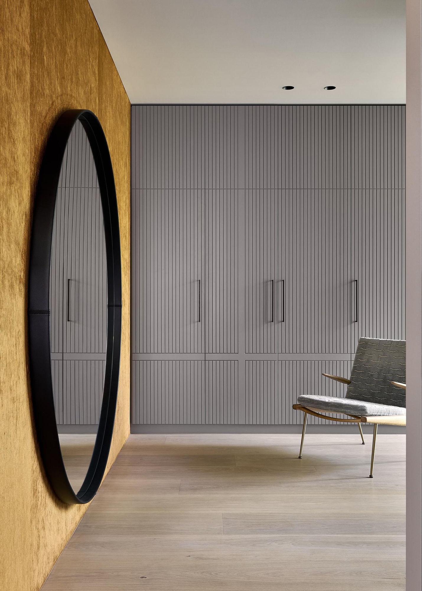 Around 300m2 of oak 3-layer Select floorboards in 21x300 mm from pur natur as well as solid oak stair treads were laid in this private house in Munich. At the client's request, the floorboards and steps were treated with raw wood effect oil and finely sanded to give the floor a natural look and feel. The surface was finished ex-works in our factory in the Black Forest. The brain-side joints of the falling lengths are not chamfered, but lightly broken by hand with a sanding block. This gives the impression that the planks are continuous. In order to guarantee a special longevity of the stair treads, the edges were specially sanded. In collaboration with Jacob & Spreng Architekten and Stephanie Thatenhorst Interior, a feeling of unique naturalness was created here. From the measurements to the planning and production of the wood products to the installation, everything in this project was handled by pur natur. The result: an outstanding object that lets the high quality of pur natur wood products shine in all their beauty. This project is proof that oak planks can create a »light« expression in a room. Warm colour tones create a connection to nature. The oak floorboards complement the dark green of the kitchen to create a harmonious whole. Oak planks were also laid in the bathroom. Minimalism paired with naturalness. pur natur.