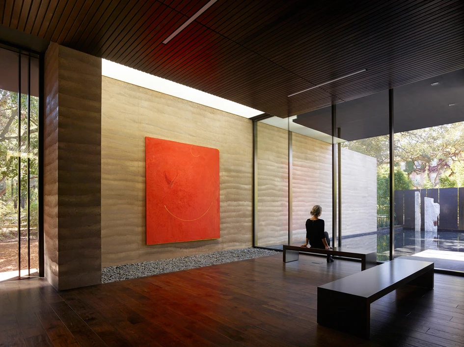 Water, in conjunction with landscape, is used throughout as an aid for contemplation; fountains within the main gallery and the courtyard provide ambient sound while a still reflecting pool to the south reflects the surrounding trees. Exterior contemplation spaces are integrated into the use of the center, allowing views to the natural surroundings as well as to the paintings within. From the oak grove to the east, visitors can view the paintings glowing within the center without accessing the building, effectively creating a sanctuary for the Stanford community day and night.