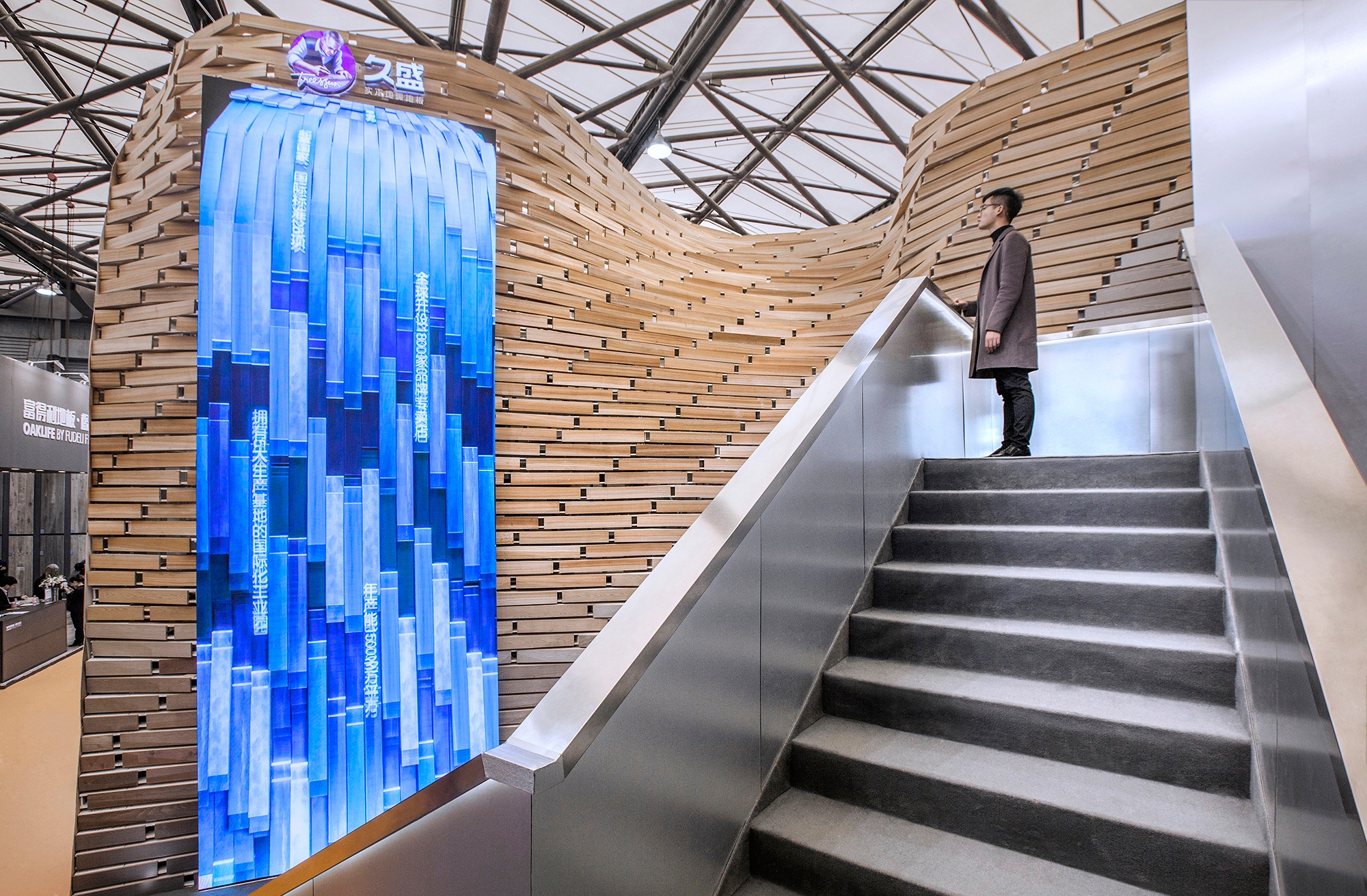 The sightseeing tour around mountain and water is divided into three stages, “going up to the hill”, “sightseeing on the hill” and “going downhill”. Wood floors in different shades depict a picture of overlapping peaks, which is similar to the rendering effect of inks. The metallic luster of the twisted and futuristic stair forms a strong contrast with the texture of solid wood. On one side of the downhill path, multimedia technology was used to simulate the sound and color of a plunging waterfall, which implicitly shows representative honors the Company (TREESSUN) has achieved via scrolling Chinese words on the digital screen.