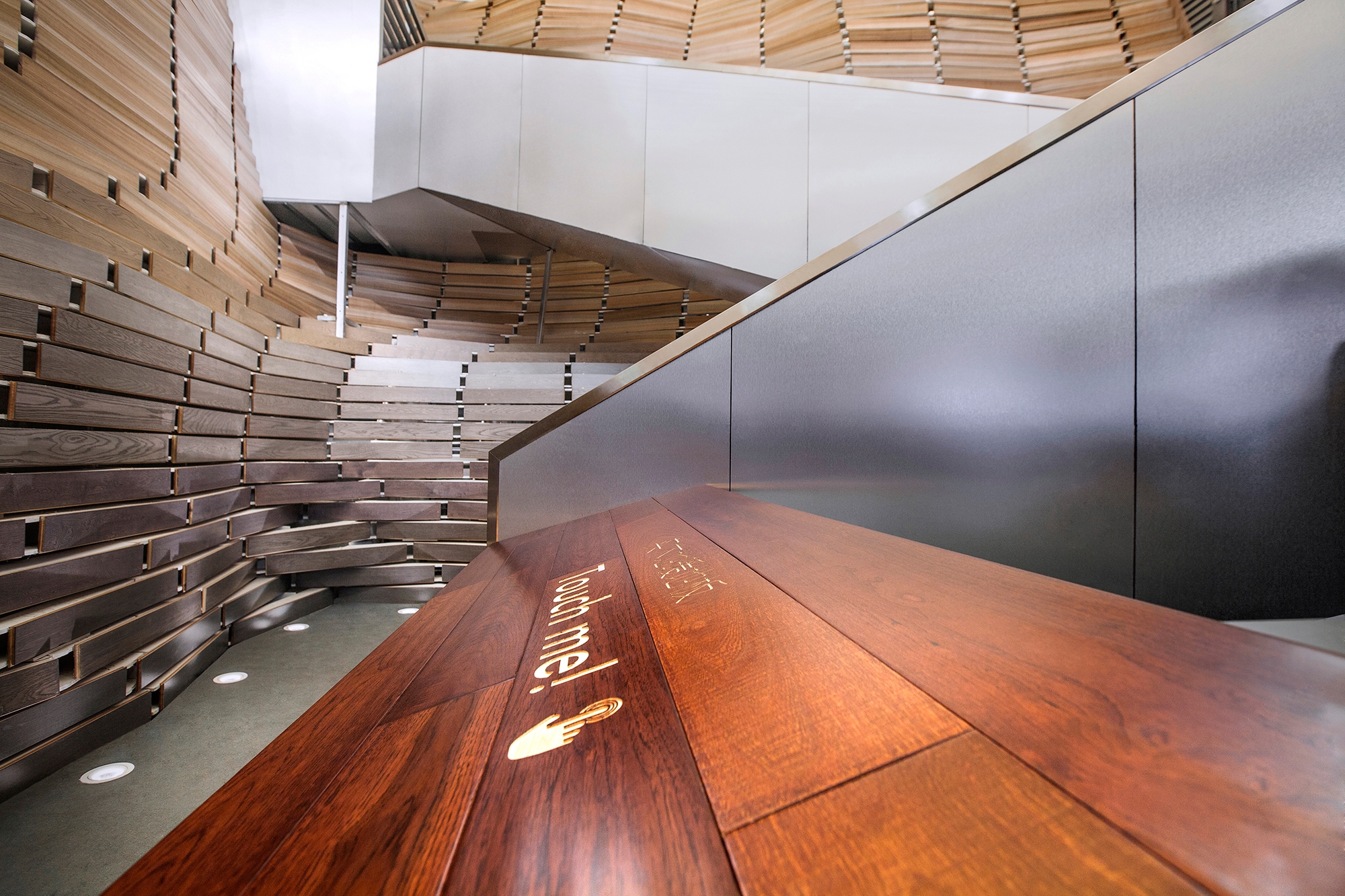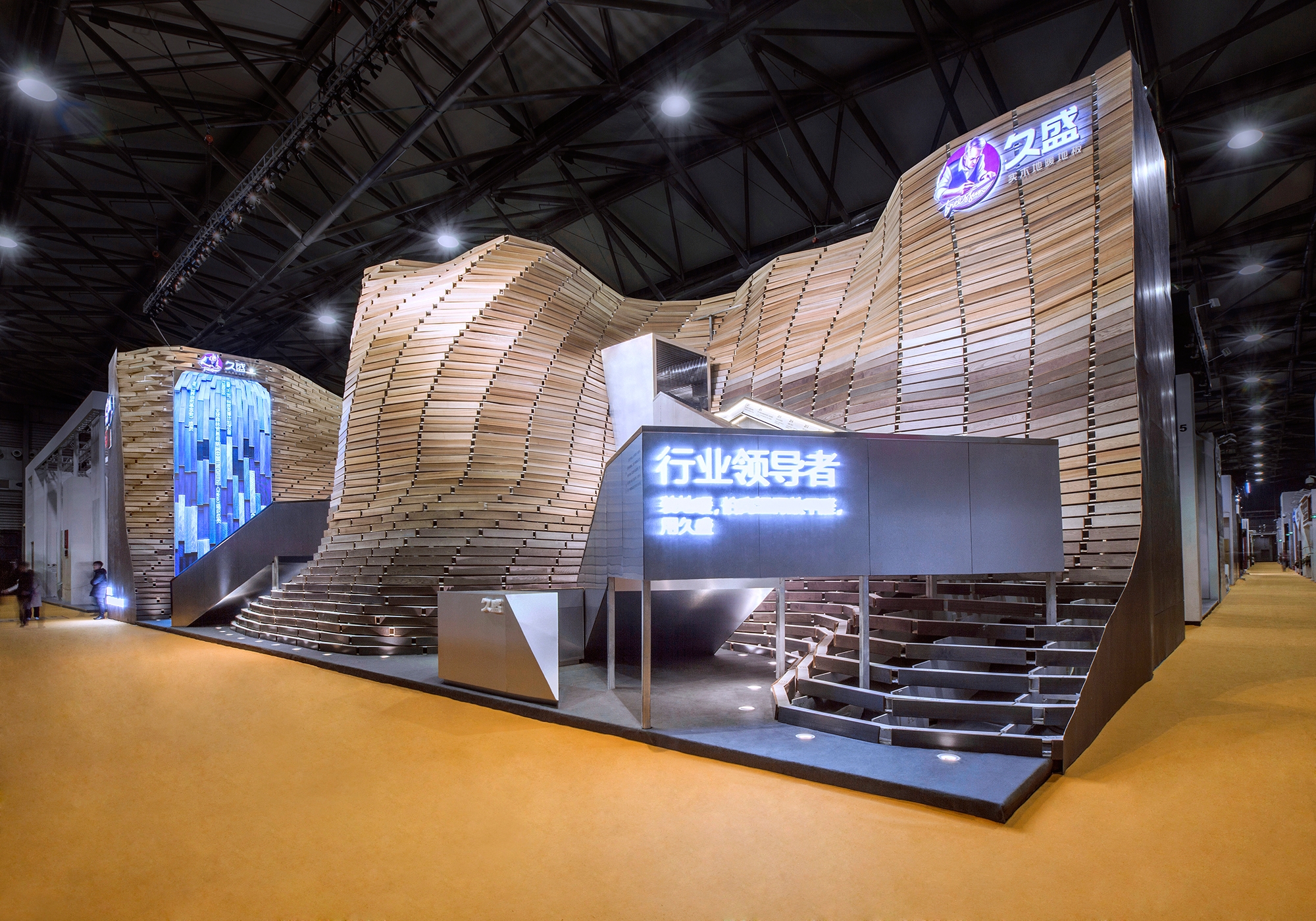 Through drawing inspirations from traditional Chinese landscape painting, TOWOdesign integrated the display of wood flooring products with an experience of sightseeing tour. The studio applied parameterization design to generate curved surface of the “wood-made mountain”, assembled thousands of wood flooring components into a “mountain massif” by decomposing and processing different parts via programs and numerical control machine, and meanwhile gave wood floors a shape of “flowing water” by utilizing multimedia technology.