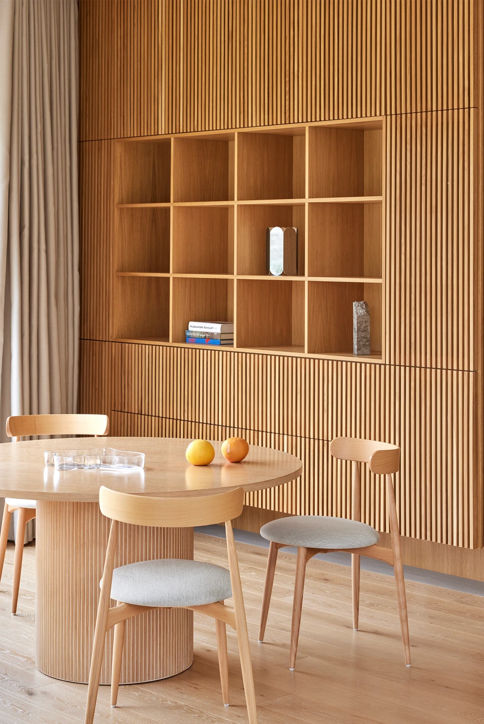 The motive of wood is used as a spine for the interior organization. Honey like oak veneer panels extend throughout the space, leading the way to the central compositional element of the living room – square picture window. Orange oak wall unfolds itself into bespoke living room cabinets – a spacious cluster of closed and open shelves. Repetition of timber elements, a small allusion of a honeycomb, is designed to obscure rarely used homeware.