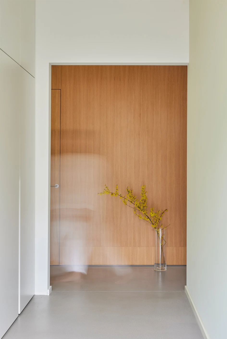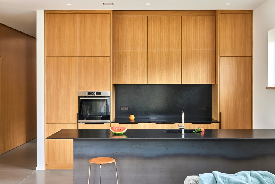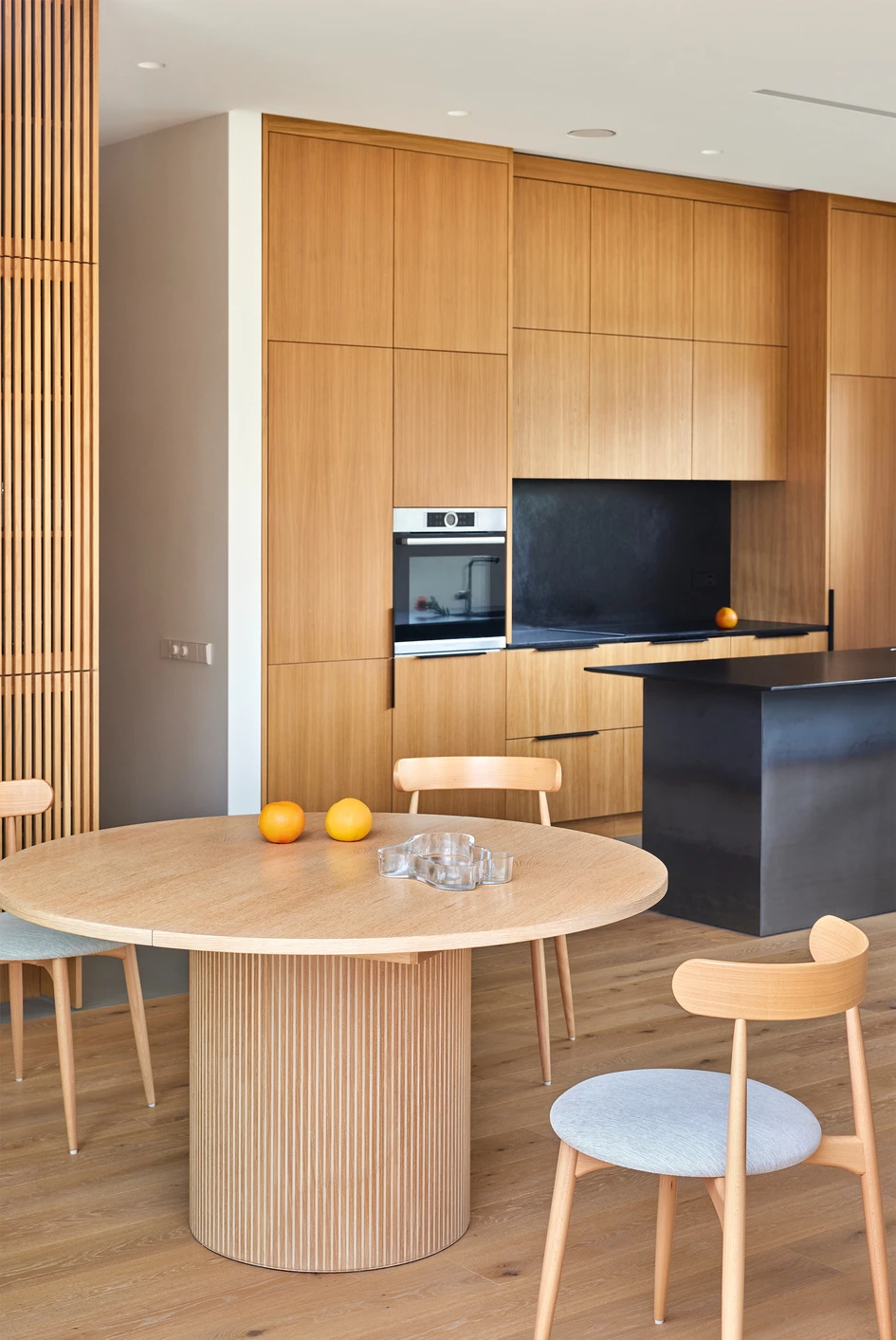 One of the clients’ expressed wishes was to design the interior in such a way, that it would look beautiful with little time consumption. Therefore, we chose to work with few essential materials keeping away from the idea, that interior space is a finished composition. It is easy to keep the space clean and simple, so the spontaneous moments of everyday life, such as a bringing flowers or fruits home, become a nice ever -changing detail.