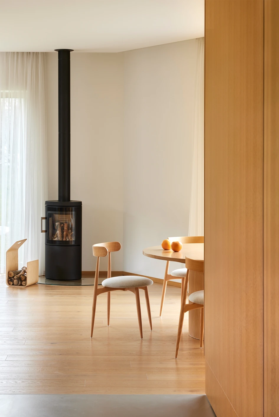 The character of the interior is modest by the choice of one main material – wood. However, it is also rich in multiple ways, when designed with different qualities that wood can offer.