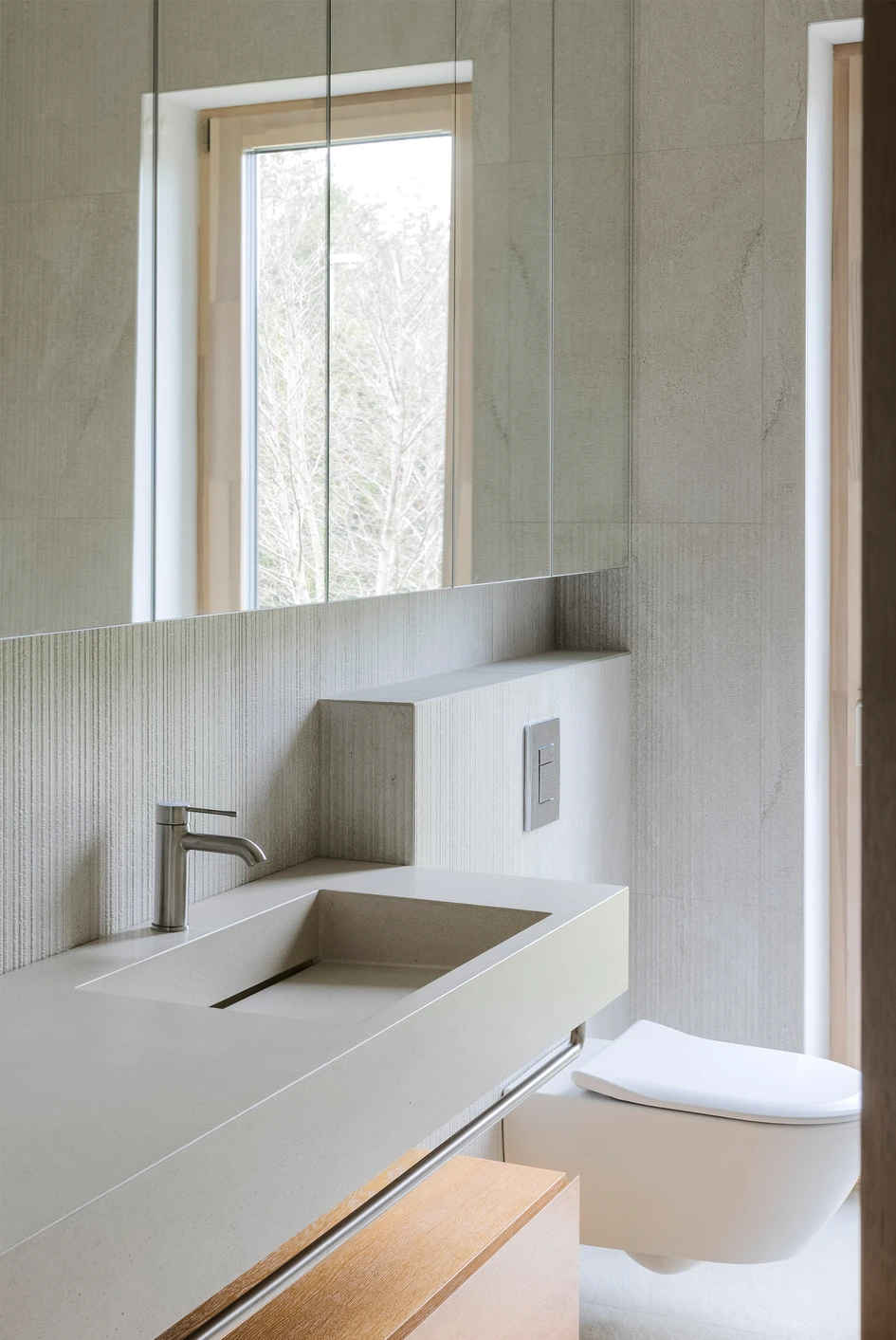 We chose to embrace particularly warm color of wood, which was challenging and rewarding at the same time. Balanced by lush nature views, framed by generous windows, warmth of wood helps to attain vibrant and evocative character of space.