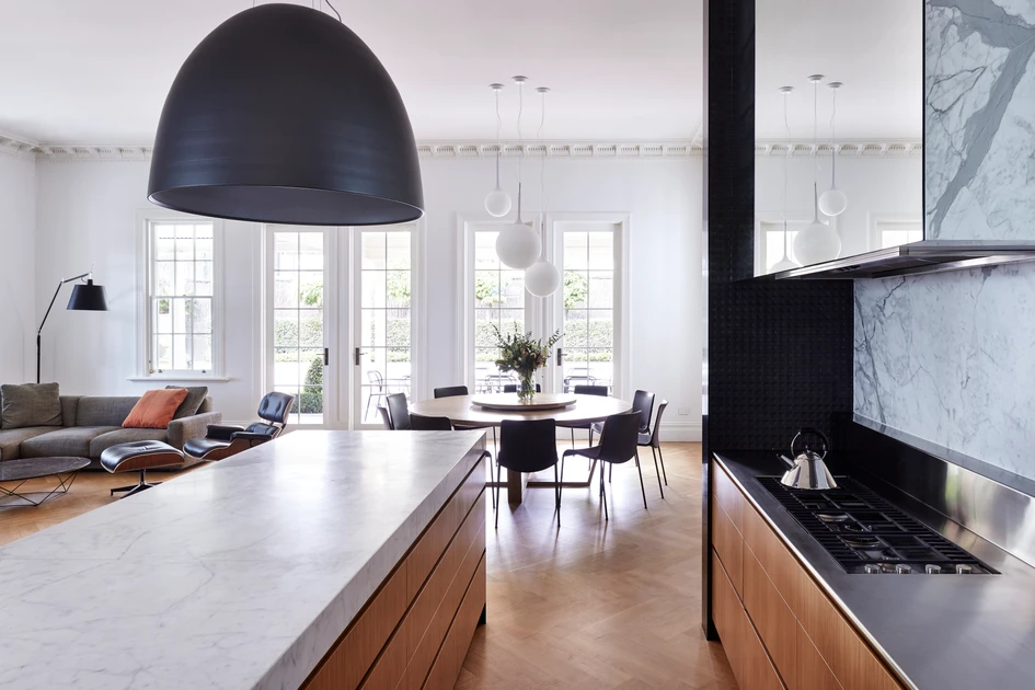 The clients brief was to create a new interior that was completely different to the existing home. Rooms were dark with restricted connections to windows and outside spaces. Materials were heavy; dark timbers, colours and finishes enclosed the space. The design created and opened a new interior with better connections to adjacent spaces, gardens and terrace and provided new access to natural light and ventilation.