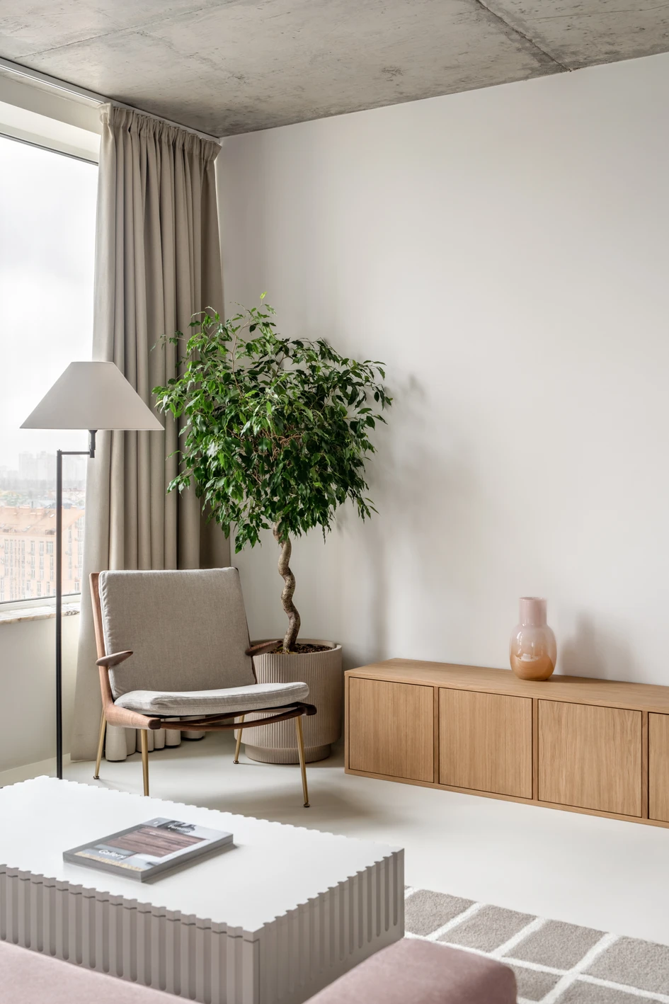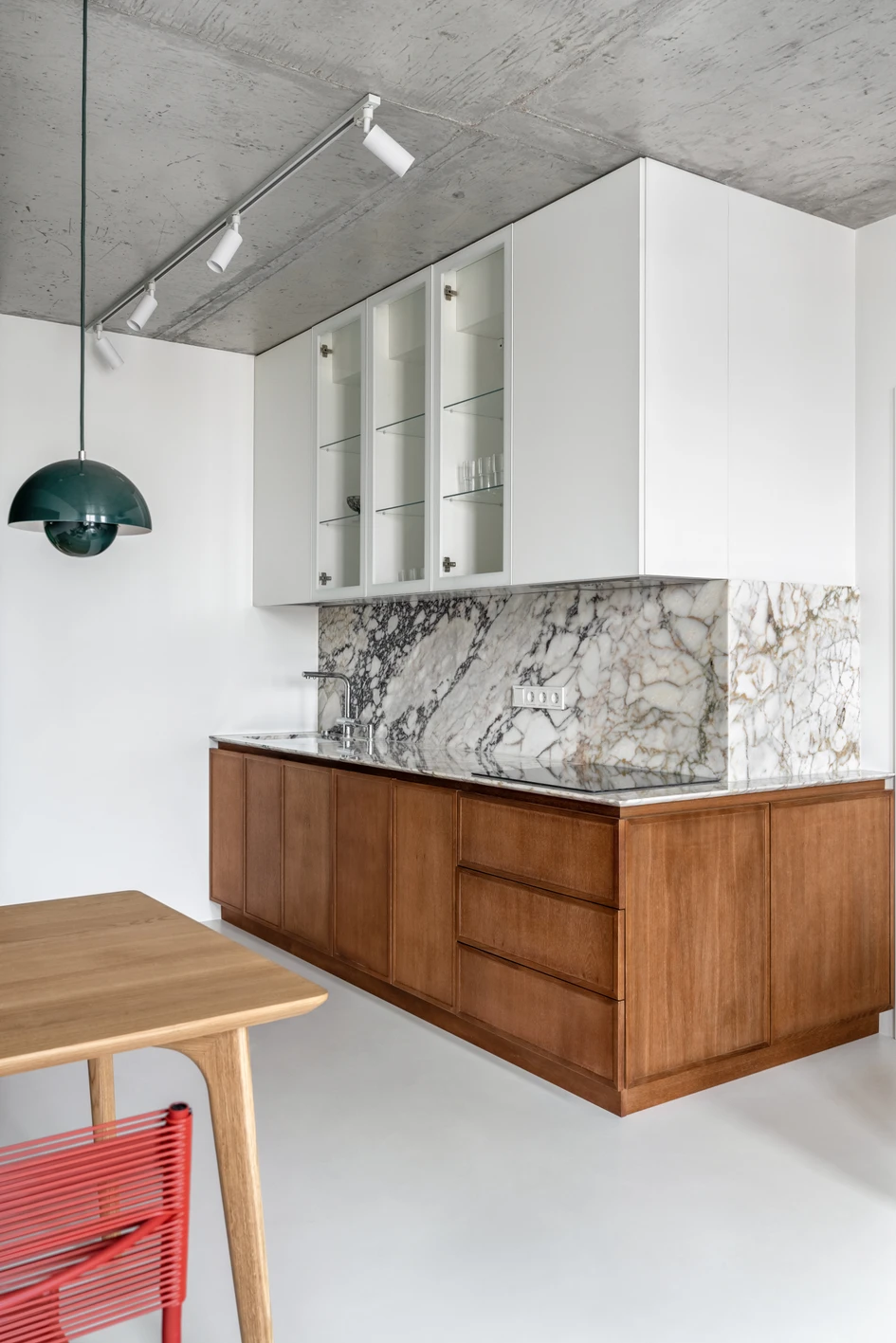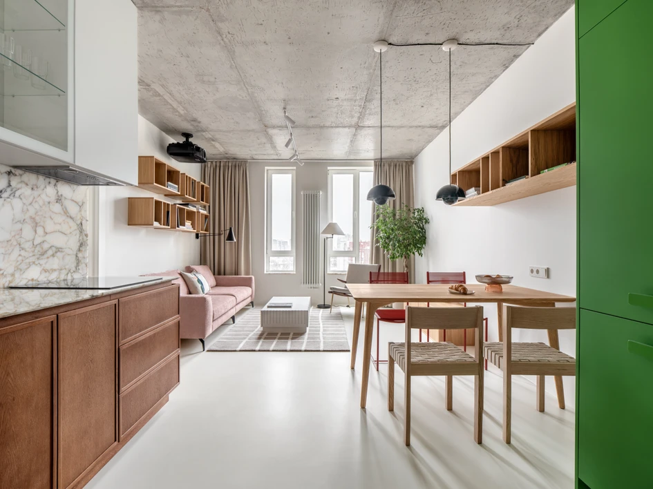 Introducing Old&New - a project that seamlessly blends opposing elements to create a playful and intriguing space. The design plays with contrasts, combining rough concrete with warm wood and modern recycled plastic materials. It incorporates forms and narratives reminiscent of the client's grandmother, such as vintage mirrors, rattan and carpets.