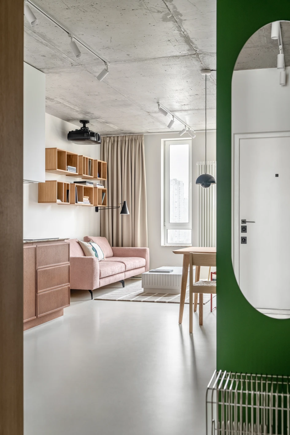 Despite the small area, the majority of the space was given to the private area in the form of a bedroom, bathroom and wardrobe. We created a private area with a connected bathroom and bedroom in a small space. And what's more, lying in the bathtub provides a stunning view of the slopes of the Dnieper river in Kyiv.