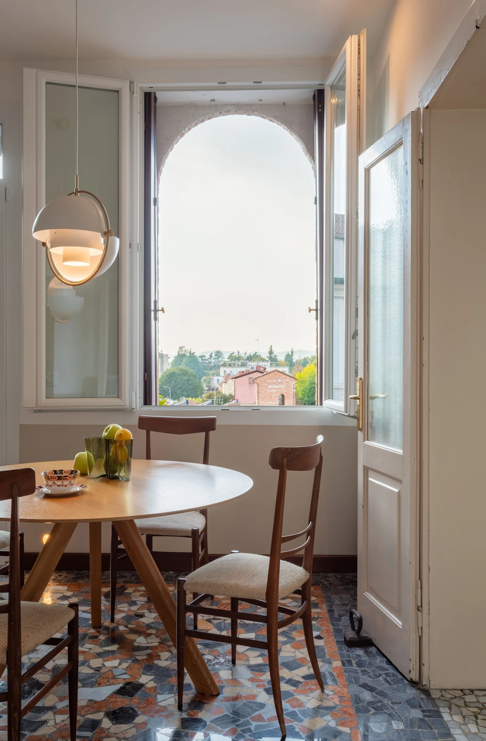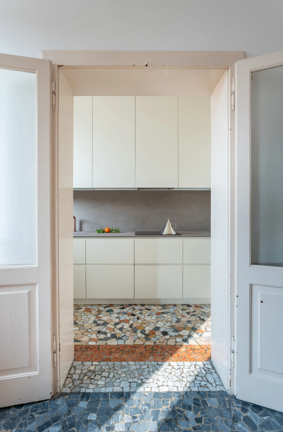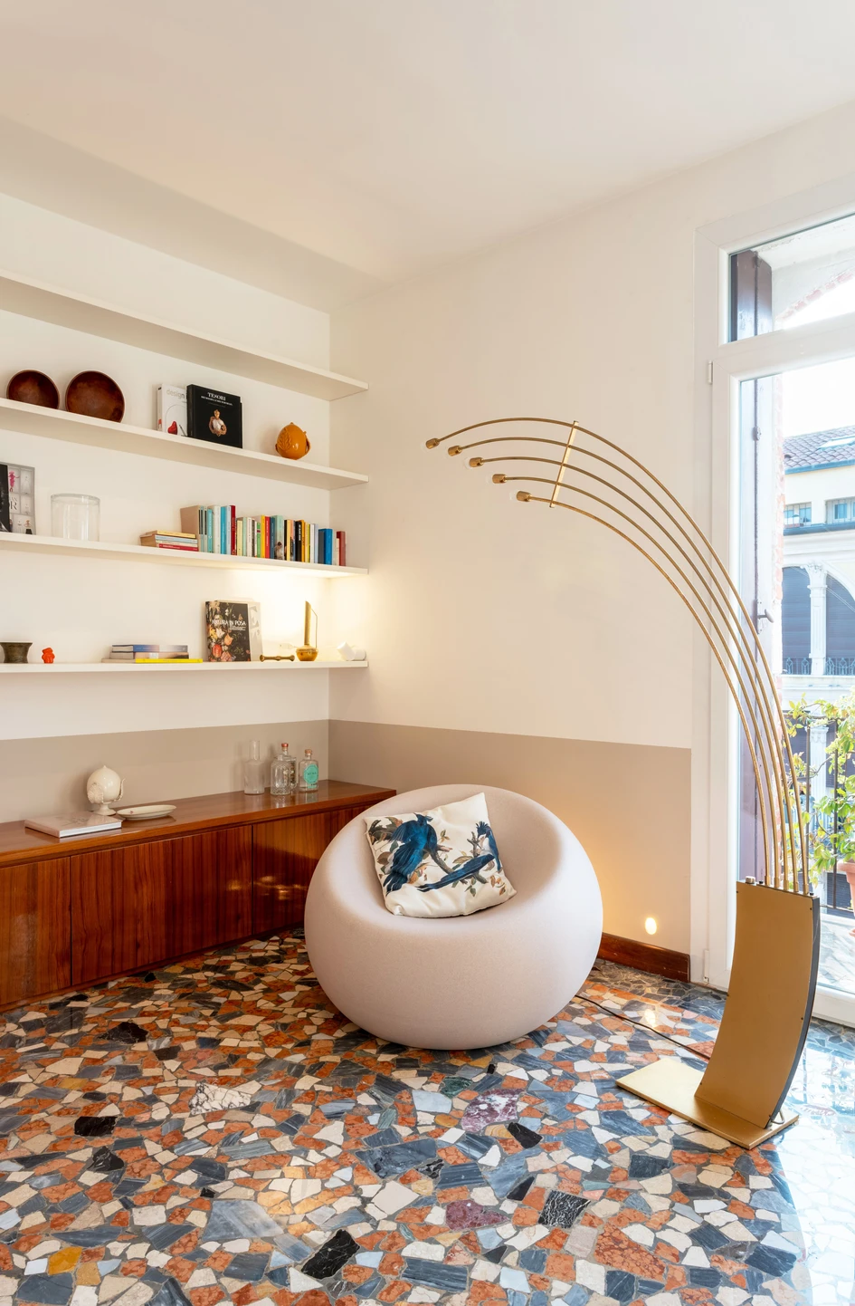 The current owner has expressly asked to renovate some portions of the building in a conservative way, together with the request to transform the top floor into her new home after a few years spent abroad for work. The main feature of the project was to respect every single existing finishing to maintain the testimony of the building from the beginning of the century. The house enjoys an enchanting view of the Salvi gardens, which it overlooks through a balcony that leans over the stream that animates the entire path of the park with a gentle waterfall. Exposed to sunlight on all sides, the house enjoys natural lighting at any time of the day. The restoration of the original finishes required the use of those few craftsmen still able to create and restore the antique Venetian floors: floors made with portions of marble of various colors, combined according to a precise setting and enhanced by a specific polishing that made this surface bright and vibrant.