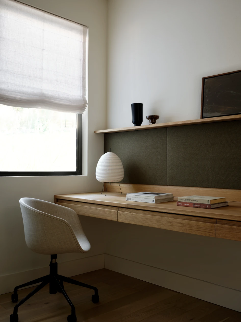 Numerous bespoke features were designed for this home, reflecting a thoughtful approach to functionality and aesthetics. The fully custom office desk includes discreetly hidden outlets at the back with cord storage, while a linen backsplash serves dual purposes as a pinboard – a thoughtful design choice catering to the homeowners who both work from home. The kids' study hall desk mimicked this design with a white oak floating desk with hidden cord management. The powder room showcases a woven wallpaper complemented by fluted wainscoting covering the lower half of the room, warmed by unlacquered brass accents. The guest bathroom stands out with a light well that spans the entire wall of the vanity and shower, creating a continuous infusion of natural light throughout the day, and enhancing the overall brightness of the space.