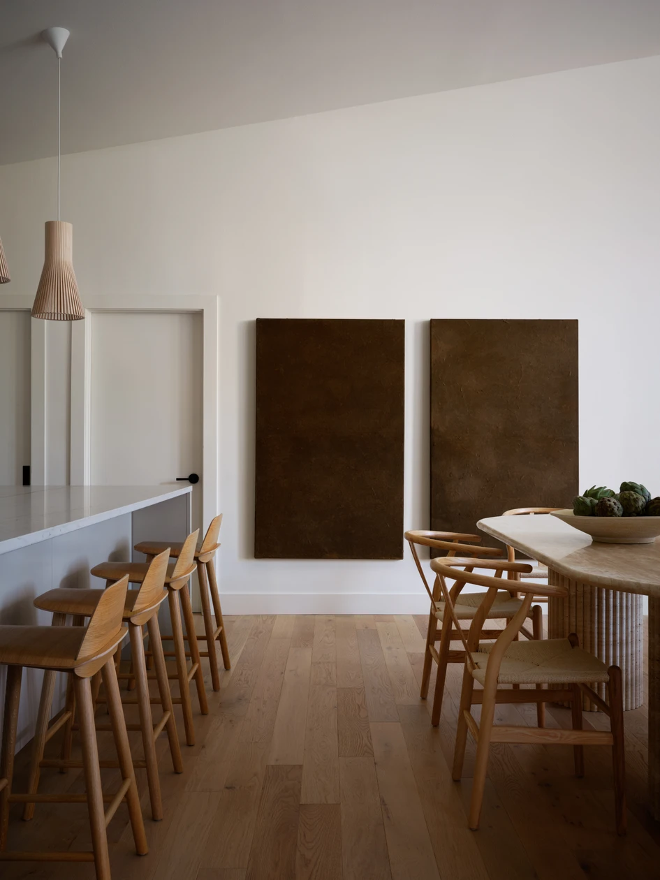 Last but not least, the home was finished with a curated selection of modern Scandinavian furnishings, featuring iconic Kaare Klint Safari chairs, sofas sourced from Ferm Living and New Works, and lighting fixtures handcrafted by Allied Maker. Adding a touch of local craftsmanship, the coffee table was meticulously handmade from limestone and white oak by the talented artisan Yucca Stuff. The chosen materials for the coffee table not only contribute to a cohesive design throughout the home but also harmonize with those used in the vanities in the bathrooms.