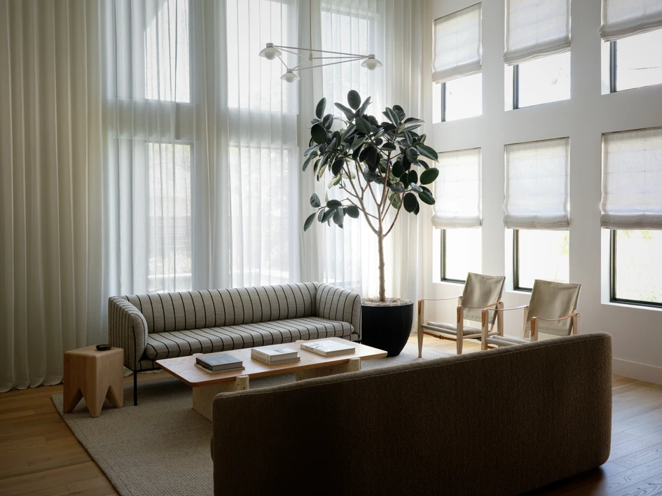 The design direction of this residence draws inspiration from Scandinavian design principles, incorporating luxurious natural materials, elevated finishes, and elegantly simple yet sculptural light fixtures. Adding a touch of drama to the main living space, linen drapery gracefully hangs from a towering 14' vaulted ceiling in the living room.