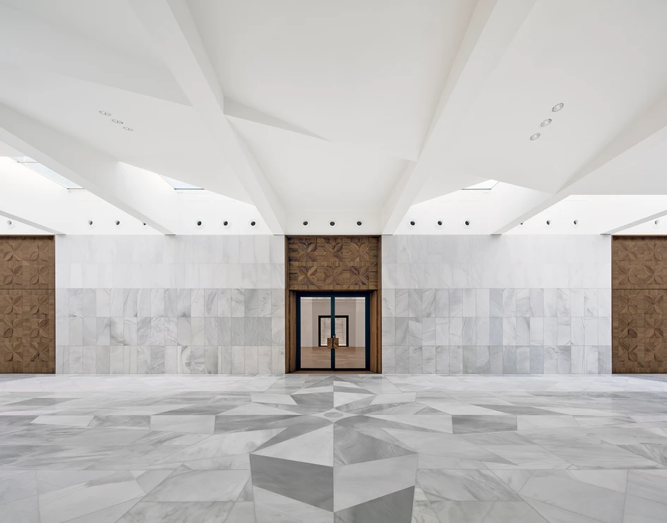 Rather than creating a prominent entrance that could encroach on the open Bassecour, the entry points have been positioned at the ends of the palace wings. Traces of the past remain visible in the subtle marble inlays on the walls where the old structure was hollowed out to create the lantern-like entry pavilions. Visitors are guided down to the light-filled balcony, which hosts all necessary visitor facilities and leads into the Foyer.