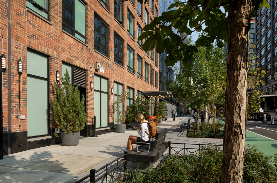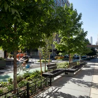 Hudson Square Streetscape Standard – Completed 2022 – This award-winning initiative provides a signature, sustainable streetscape for the district, comprising 500 trees including both new and existing trees retrofitted using the HSS sidewalk tree planting system. Combining structural soil, porous aggregate, permeable pavers, and distinctive tree guards, both the trees and the city benefit from captured stormwater, increased biomass, and real estate values.