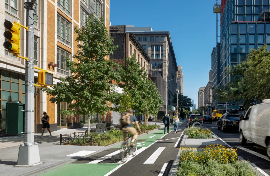 Hudson Street Reconstruction – Completed 2022 – Transforming this vital street into a grand thoroughfare, this project extends sidewalks up to five feet and adds new amenities along its seven-block corridor. Enhancing pedestrian, bicycle, and vehicular traffic safety, transforming the corridor into a grand boulevard that will increase connectivity. Over 8,000 square feet of planting areas are filled with trees, shrubs, and perennials, and the application of the Hudson Square Standard for urban forestry, using continuous tree pits and permeable pavers to maximize stormwater capture and support healthier trees, was employed. New benches provide approximately 170 seats, and there are over 2,000 square feet of allowable space for future sidewalk cafes. Sidewalk realignments, new pedestrian ramps, a dedicated parking-protected bike lane on Hudson Street from Houston to Canal Street, and more than 70 additional bicycle racks add to public enjoyment.