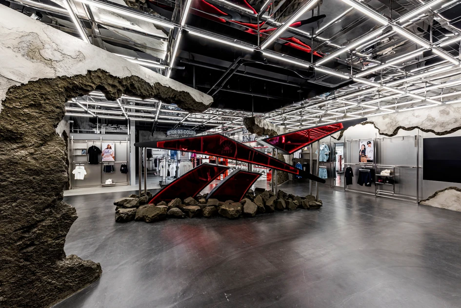 Such a new Reebok flagship store’s interior concept boldly reveals a new 1st generation sportswear brand concept, ‘Superhero Re-landing.’ This very bold design concept is evident from the entrance of the store. The emblem in front of the façade symbolizes a hero figure sinking through the ceiling of the building, thus adding impact to the new presentation of Reebok’s brand identity.