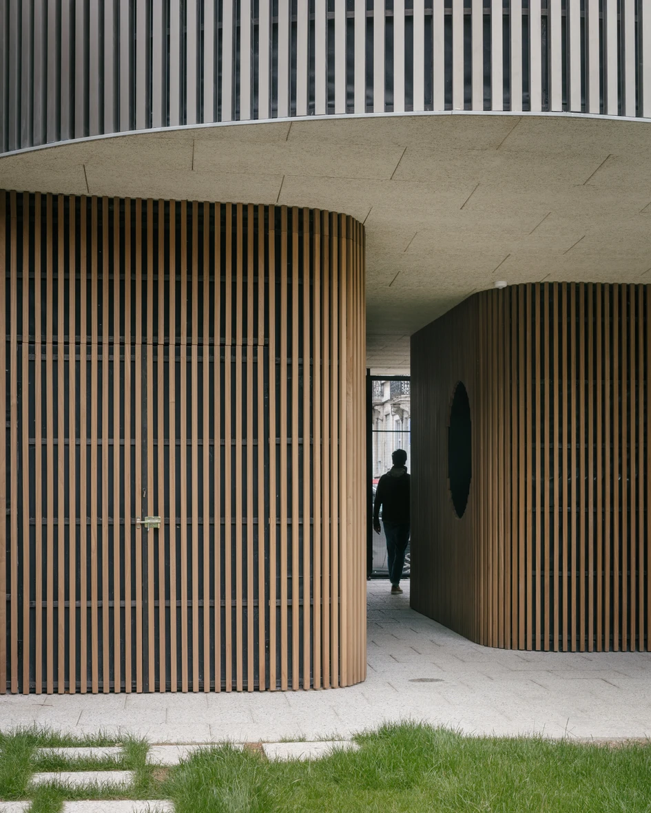 A facade wielding such commanding spatial narrative warrants a reciprocal architectural rejoinder. Thus, the edifice stands as both a pivotal juncture and a resolute datum, orchestrating the perspective. Engaging in a dialectical exchange with its angular counterparts across the way, the facade derives its aesthetic trajectory directly from the built environment. Distinctly lighter in its materiality than its environs, it imparts a subtler aesthetic cadence, thereby affording the neighboring structures the liberty to maintain their preeminent architectural vernacular.