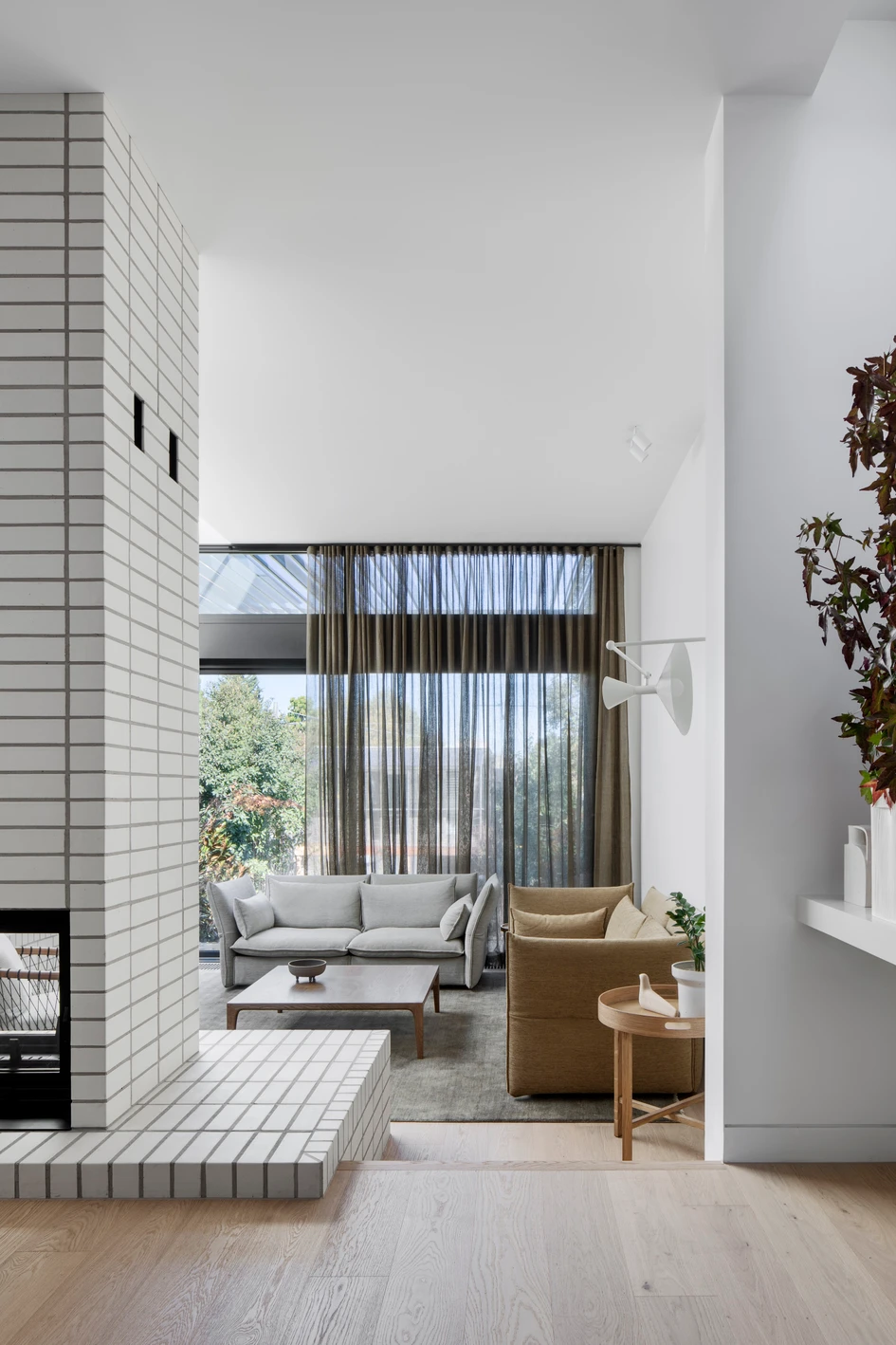 Existing spaces in the original front part of the house have been largely retained, refreshed by new internal finishes and light fittings. A new generous kitchen and dining at the rear are separated from a sunken living room by a double-sided wood fireplace and hearth, whose white stacked brickwork provides a solid visual anchor for the surrounding spaces.