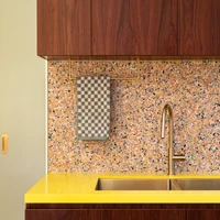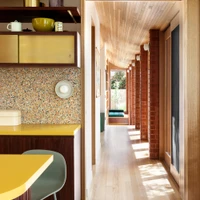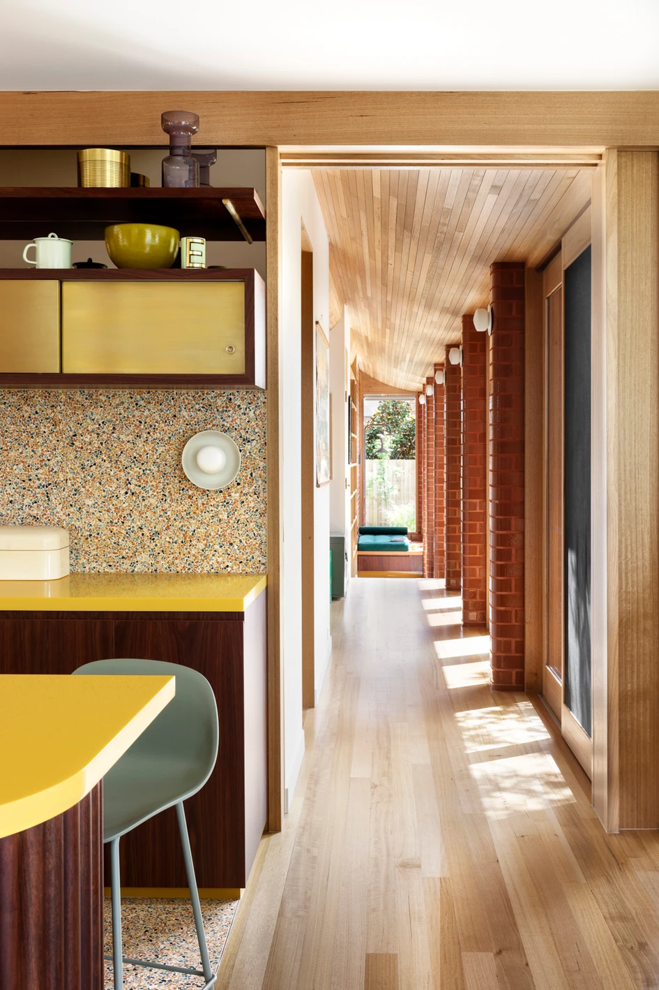 The kitchen feels generous with the banana-yellow bench space and seating for all kids. The dessert-inspired colour palette draws in the client’s mid-century furniture pieces and the mix of timber species echoes the eclectic art and object collection. Playful colour combinations were used in the ‘wet areas’, whilst the main bedroom offers a moment of respite incorporating calm tones and materials.