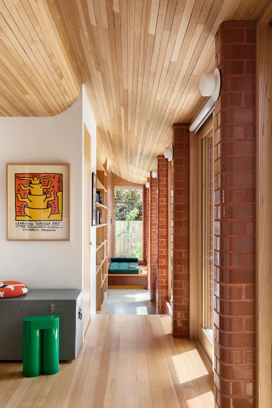 Though WOWOWA PONY packs a punch, with glorious finishes and details that bring moments of delight throughout the home, the real smarts of the project reside in the joyous union of multi-disciplinary design areas; interior design, architecture and landscape architecture, that culminate in spatial qualities and materiality of the clip-on colonnade. The hardworking colonnade is the innovation in this design. Not only does it provide a connection to the outdoors, two bathrooms and four bedrooms, but it also increases the amenity of the home, without an expanse of additional space. It’s a daybed, a bookshelf, two break out spaces that provide seating for each of the children and a clothes drying room, dispersed throughout and nestled within the undulating form and soft, structural columns.