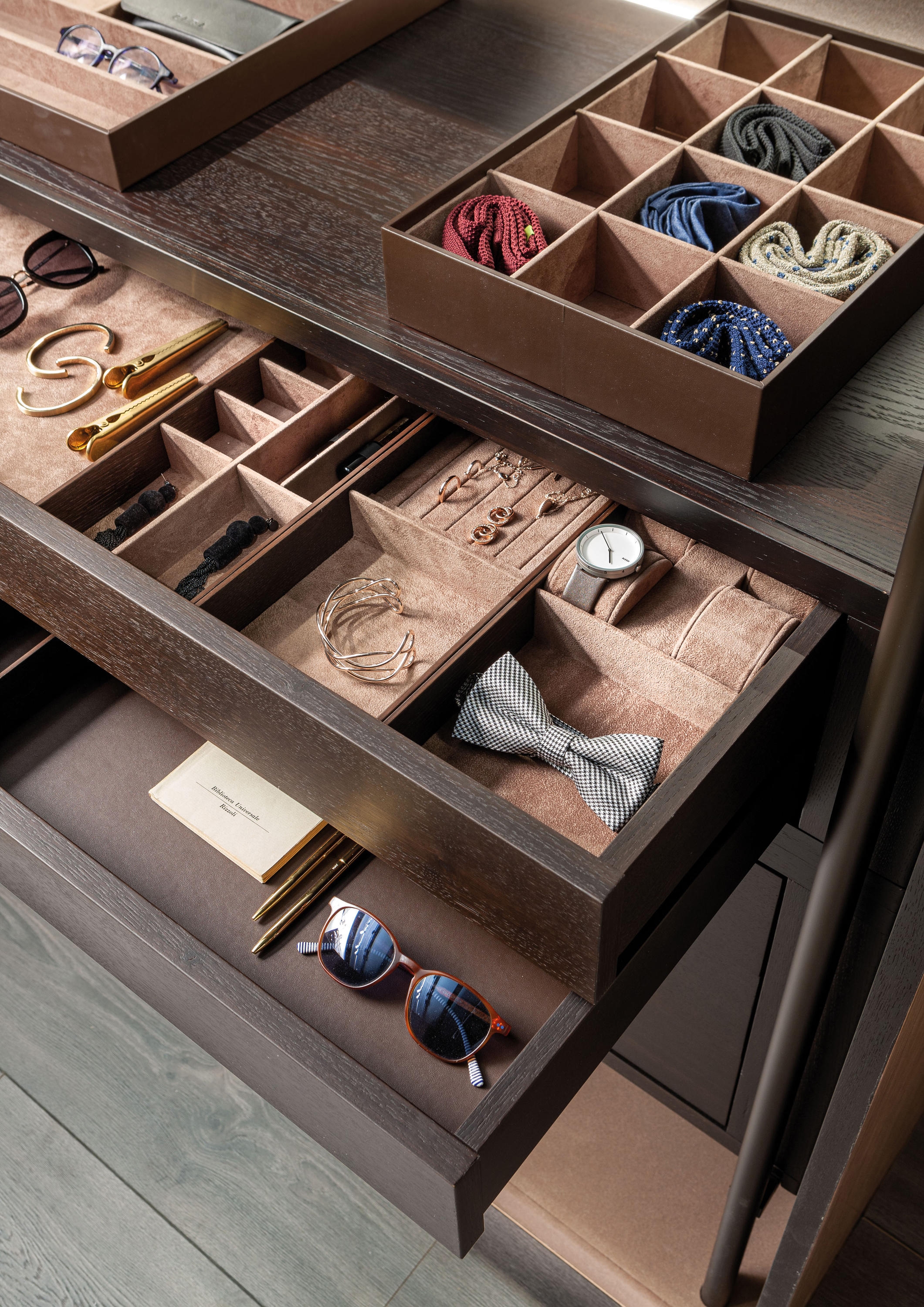 Flou's Private range shows how glass doors can both protect and present clothing collections (top), while drawer inserts create order and organisation right to the end (bottom)