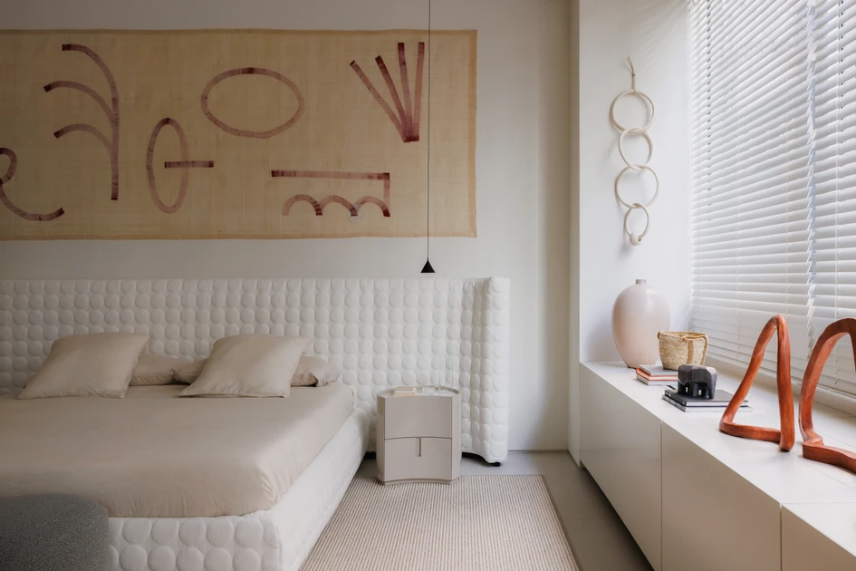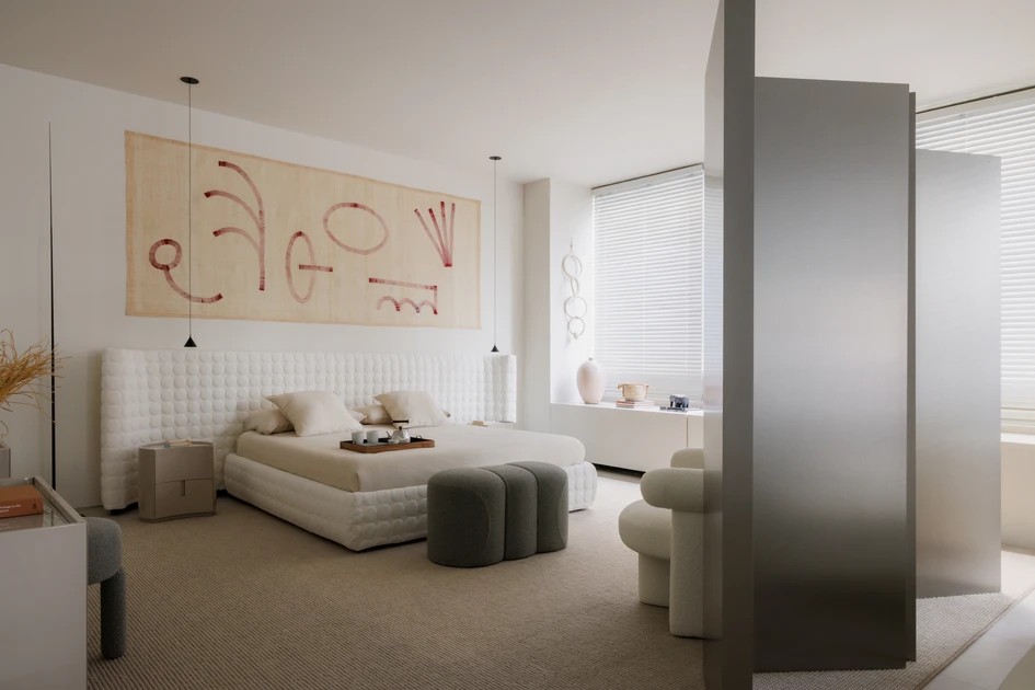 The white fabric of the René collection and the Max and James sofas creates a pure, enveloping atmosphere that extends from the living areas to the bedroom. Here, the Tuyo Curve bed in Ball finish is surrounded by the soft, rounded shapes of the Jeanette armchairs – equally white.