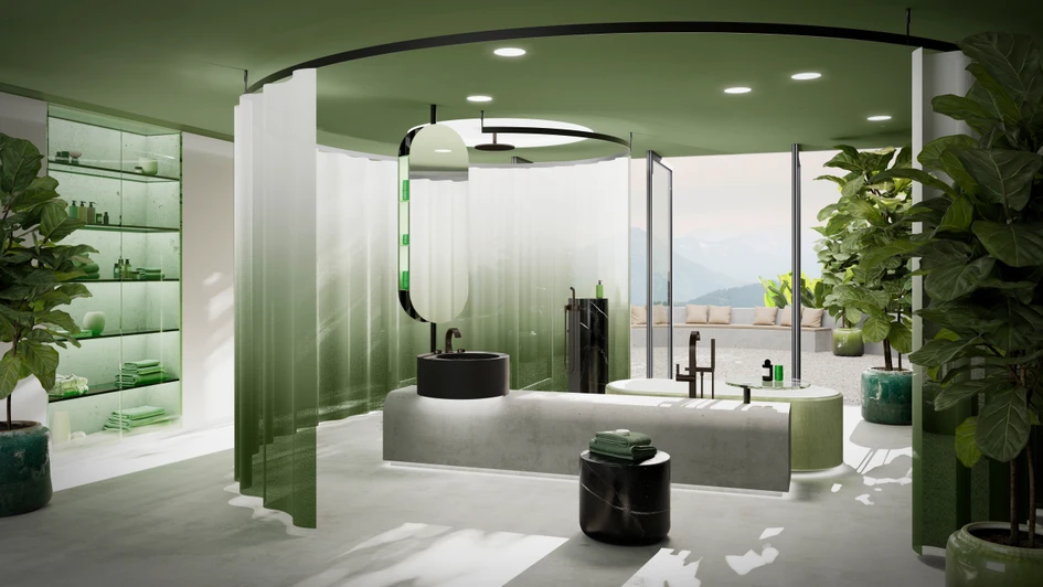 A place of longing. The Oasis Bathroom – a mix of black marble, finely polished concrete, coloured ceramics and CYO in Dark Platinum matte – stands for a new understanding of architecture as an open zone that can be freely shaped with its use