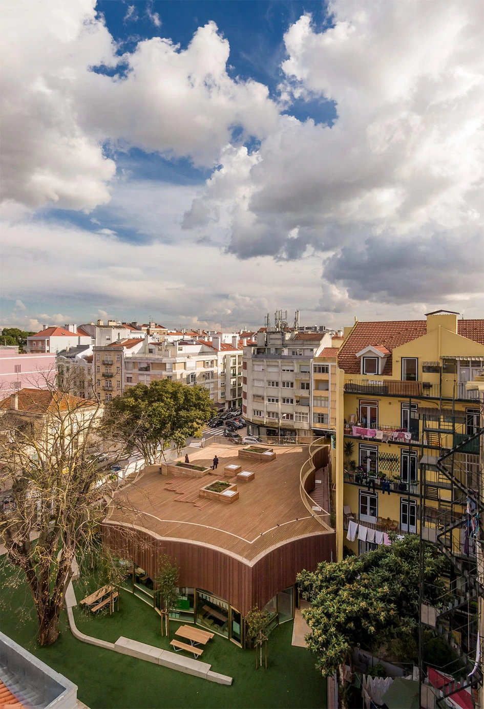 ARX Portugal Arquitectos’ Redbridge School in Lisbon: The more informal, intimate design of the kindergarten pavilion contrasts with the more open, street-facing wing for older children. Photo: FG + SG – Fotografia de Arquitectura