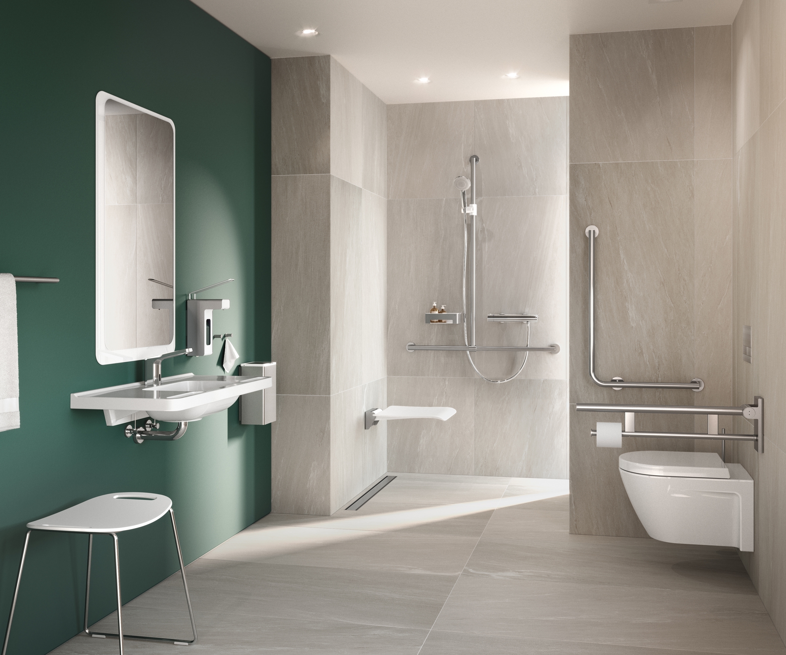 HEWI's System 900 fully meets the requirements for professional care, barrier-free bathrooms. It combines puristic design with maximum functionality, lasting quality and well-conceived installation technology