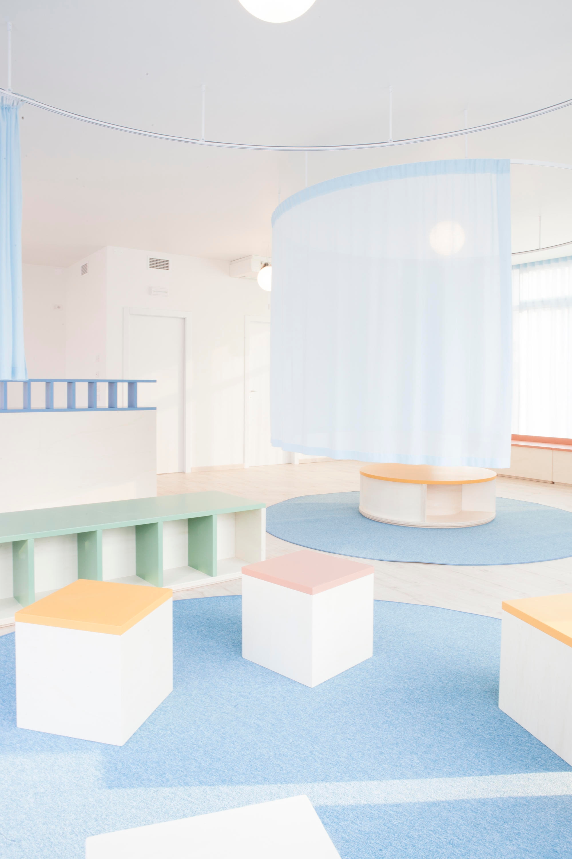 Playfulness and transparency are the themes that form the basis of this dental clinic project dedicated to children. The layout of the internal space aims to create a light and relaxing atmosphere, with the pastel shades of the furnishings helping to achieve a friendly mood. The furniture is designed so that it can be easily moved, allowing the room to be used differently every day.