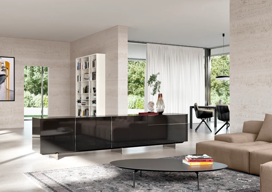 The range includes four product lines for the living and dining space, as well as two more in its newly established bedroom segment, making it possible to plan furniture ranging from sideboards and shelving units to wardrobes. In addition, there is a table, three side tables, and two beds. ‘The uniform grid and the fact that we offer 99 per cent of all our product lines in the same surfaces and colours allow all series to be combined with each other in a harmonious way,’ says Kettnaker. The choice of materials includes lacquered fronts and fine wood veneers as well as rear-lacquered glass and aluminium.