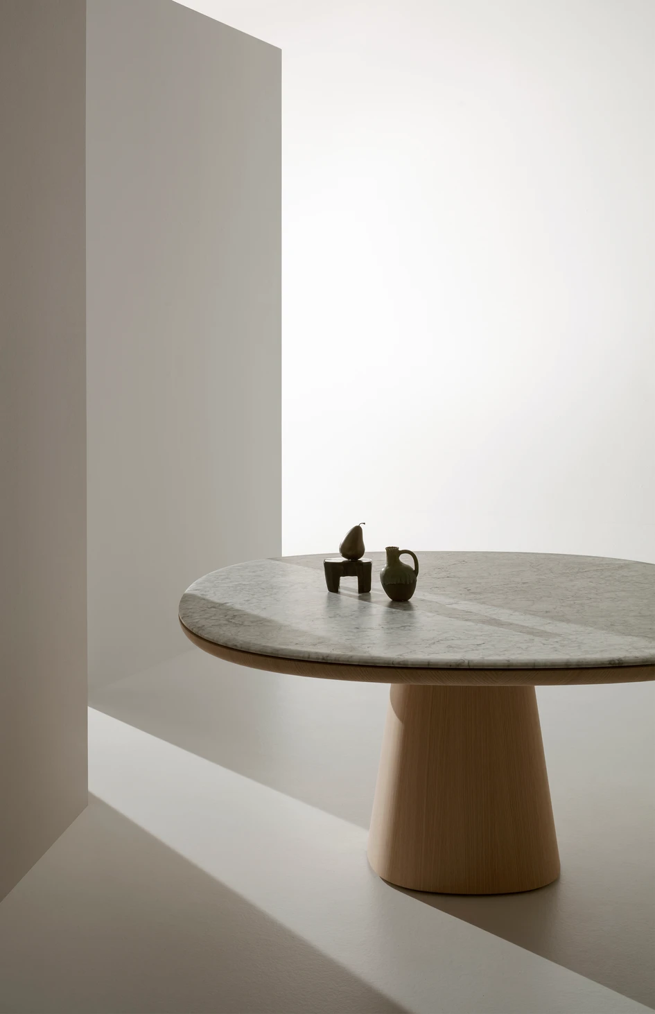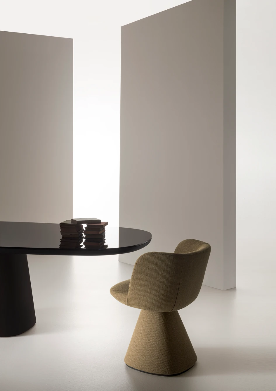 B&B Italia describes the Allure O' as a ‘graceful force’; a soft power in a space. It balances straight and sinuous lines with restraint; the tabletop with curved corners and bevelled edges, in square or rectangular shapes, is supported by a sturdy truncated pyramid base. It playfully opens up a dialogue with the Flair O' small armchair, also supported by a truncated pyramid, gently widening as it nears the floor. As a dining chair with a padded seat, a swivel base and an automatic return mechanism, it provides stability and comfort while encouraging movement.