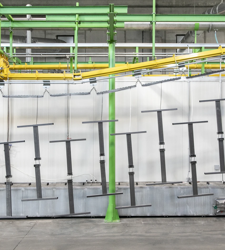 The new automated powder-coating plant is equipped with end filters of the highest efficiency that optimise the production as well as minimise the material waste and energy dissipation