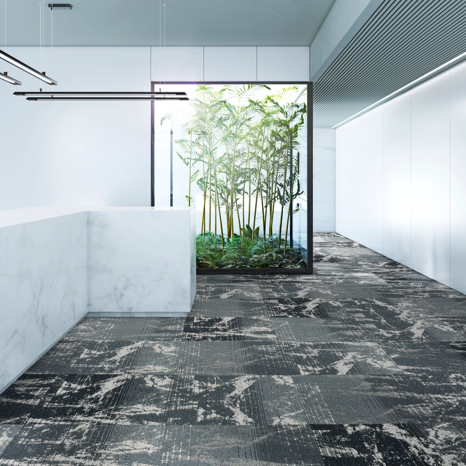 How is the metallic effect in the carpet tiles created?