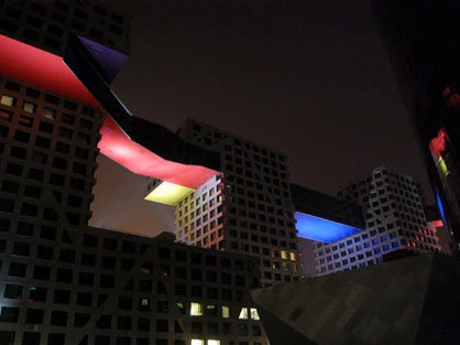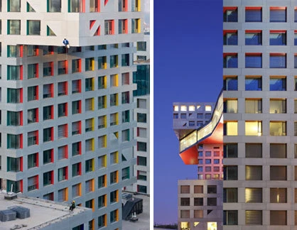 A mixed-use complex of eight linked towers in Beijing, China. Photos: Steven Holl ArchitectsA series of multi-functional “skybridges” connect the eight residential towers and the hotel tower.Geothermal wells 100m below the foundations provide heating in the winter and aid cooling during the summer.A pond in the centre of the complex holds recycled greywater from the buildings and will freeze over in the winter, transforming into a public ice rink.The earth excavated during the construction of the project has been landscaped to create a series of mounds housing public recreational areas.The project was named Best Tall Building 2009 in the Asia and Australia category by the Council on Tall Buildings and Urban HabitatThe project comprises apartments, a hotel, cinema, kindergarten, school, underground car park, commercial zones and a public green space.