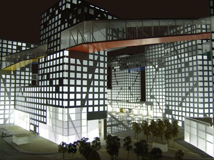 The first floor of the building, with views over the landscape, is left open to the community. The polychrome of Chinese Buddhist architecture inspires a chromatic dimension. The undersides of the bridges and cantilevered portions are colored membranes that glow with projected nightlight and the window jambs have been colored by chance operations based on the ‘Book of Changes’ with colors found in ancient temples.