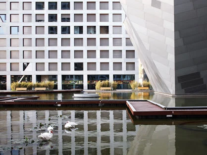 Geo-thermal wells (660 at 100 meters deep) provide Linked Hybrid with cooling in summer and heating in winter, and make Linked Hybrid one of the largest green residential projects. The large urban space in the center of the project is activated by a greywater recycling pond with water lilies and grasses in which the cinematheque and the hotel appear to float. In the winter the pool freezes to become an ice-skating rink.