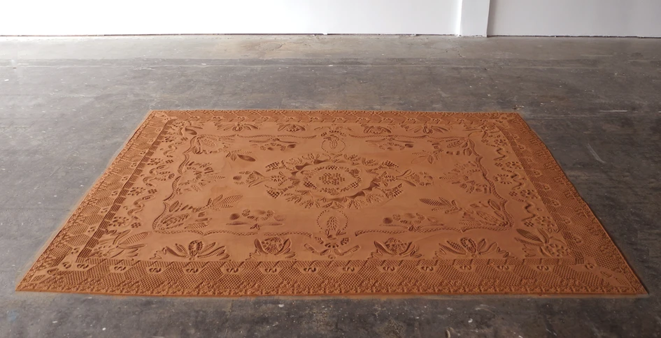 American artist Rena Detrixhe first spreads out fine red earth evenly into a rectangular shape to create a temporary carpet before using parts of soles from old shoes to emboss fine patterns and ornaments into her "Red Dirt Rug"