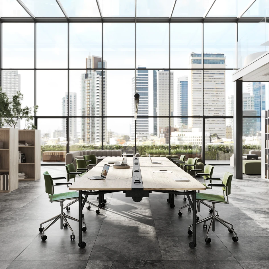 For businesses that are growing, shifting and staying agile, there should be no compromising on the quality of desk space available for workers and their productivity. Nor the activities that can be carried out. With up to 3.84 sqm usable space and seating up to twelve people, Folding Surfaces’ largest size (2400 x 1600 mm) is one of the largest available on the market with these mobile and electric qualities.‘Its versatility makes it particularly valuable in highly mobile offices and environments with fluctuating occupancy due to hybrid work models’