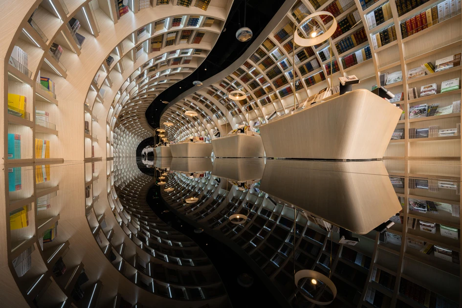 The black reflective glass used in the Guiyang Zhongshuge bookstore creates a magical hall of mirrors for readers to lose themselves. Photo: Shao Feng