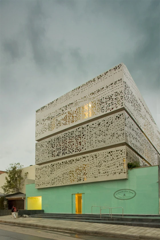 Bogotá's Spa Chairama combines glass with patterned laser-cut metal for a facade that doubles as an intricate interior wallcovering. Photos: Sergio Gomez